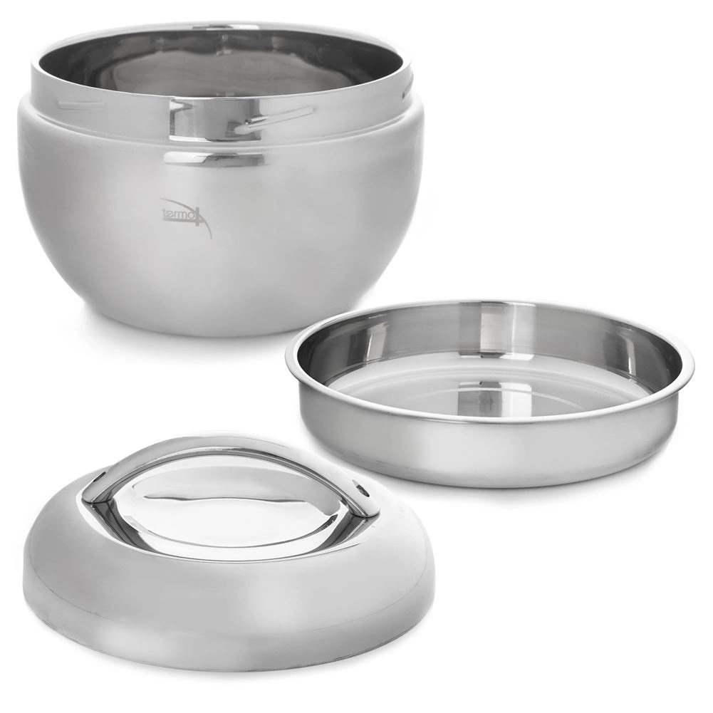 Låget lukkes med en enkel drejning, og det integrerede håndtag sikrer behagelig transport. Den indvendige aftagelige skål er praktisk til servering eller adskillelse af retter. For maksimal temperaturhold bør skålen forvarmes med varmt vand før brug eller forkøles i køleskab.