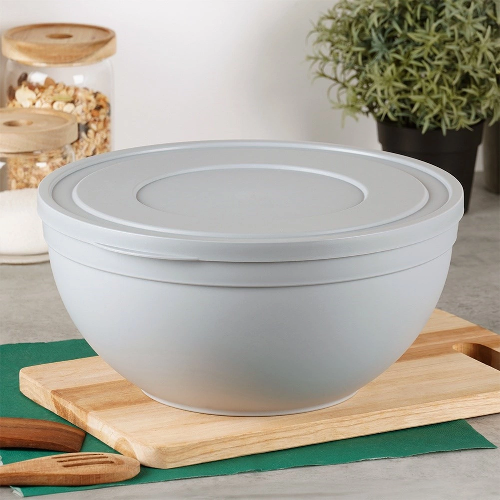 Stor skål med robust, tætsluttende låg er en fremragende hjælper til bagning og madlavning i hverdagen. Takket være volumen på 6 liter kan du nemt forberede dej til kager, brød og pizza. Glatte vægge gør det nemt at røre og rengøre, og låget sikrer friskhed og sikker opbevaring i køleskabet.