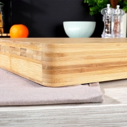 Dette massive skærebræt af naturlig bambus er en fremragende hjælp til daglig madlavning og til attraktiv servering af oste, charcuteri, frugt eller snacks. Bambustræ er naturligt modstandsdygtigt over for fugt og deformation, samtidig som det er skånsomt mod knivægge og let at holde rent.