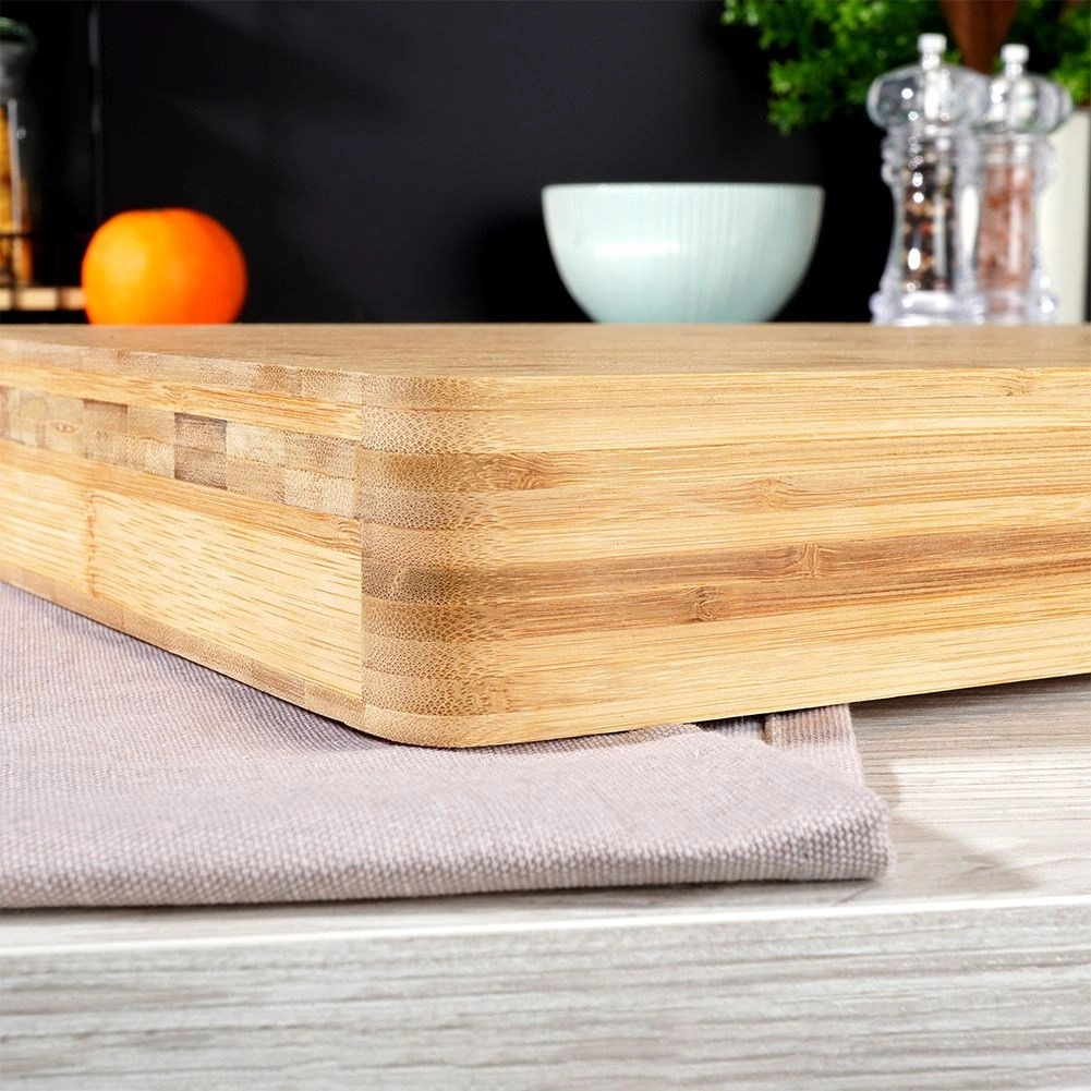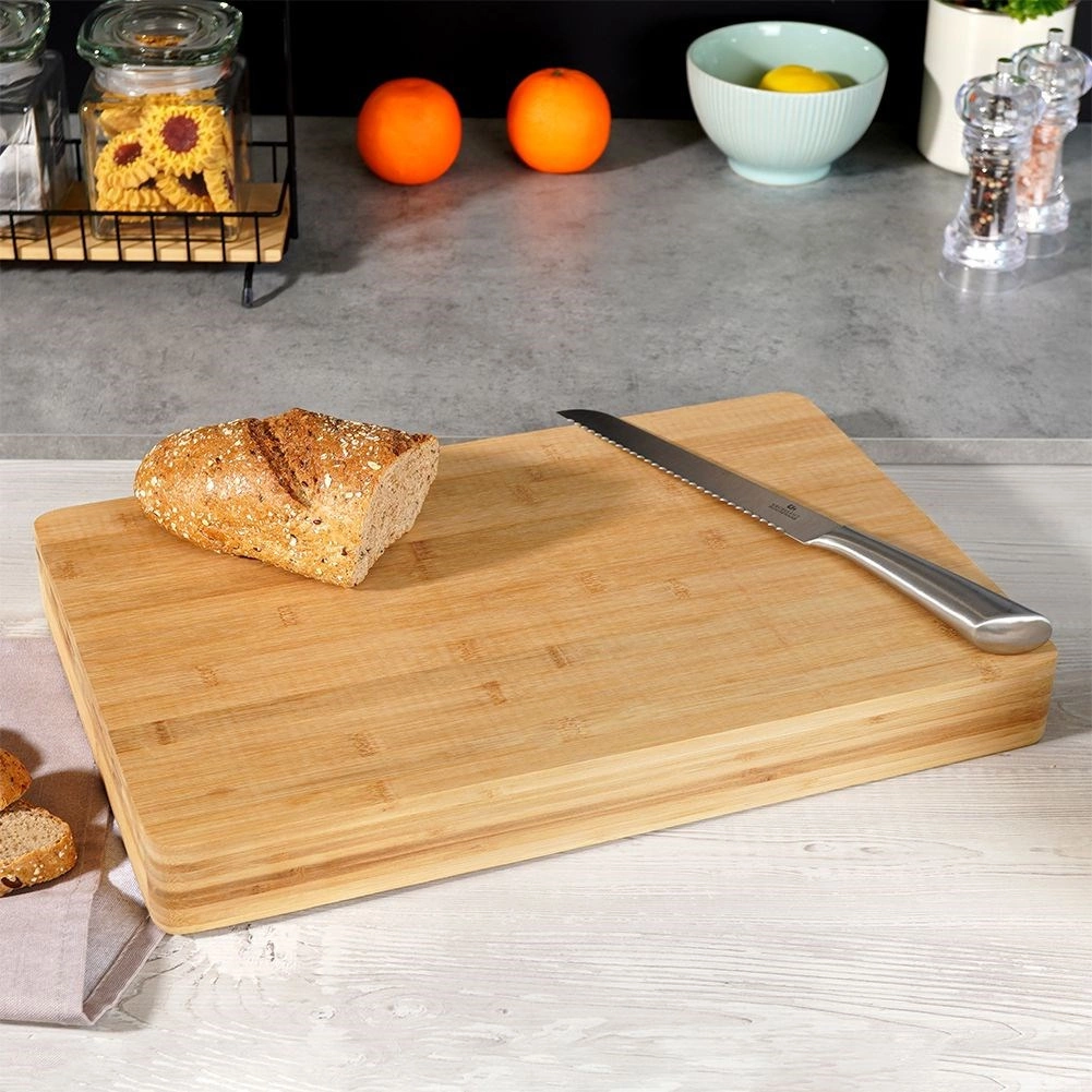 Det kraftige bambusbræt giver et solidt og sikkert underlag til både skæring og hakning og er samtidig skånsomt mod knivægge.