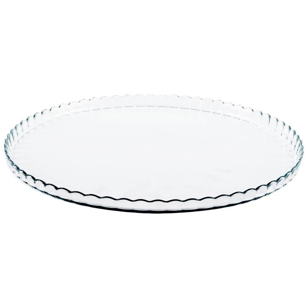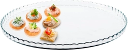 Elegant glasopsats med en diameter på 32 cm og dekorativ bølget kant, der smukt fremhæver dine desserter, forretter og kager. Den er lavet af kvalitetsklart glas, er holdbar, alsidig og nem at vedligeholde – velegnet til opvaskemaskine og køleskab. Ideel til servering af kager, tærter og desserter med en effektfuld præsentation.