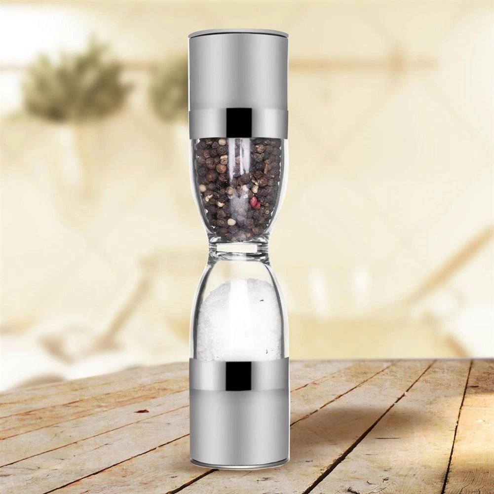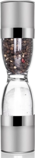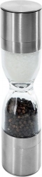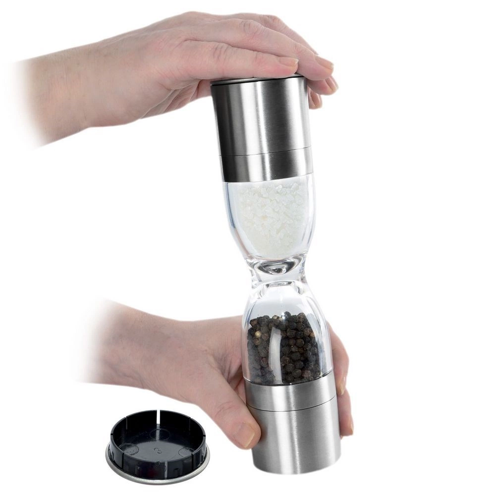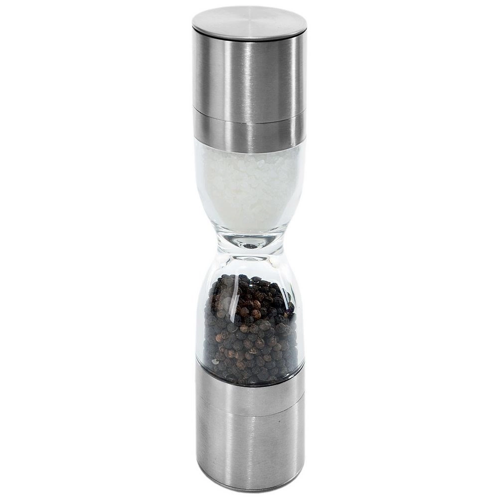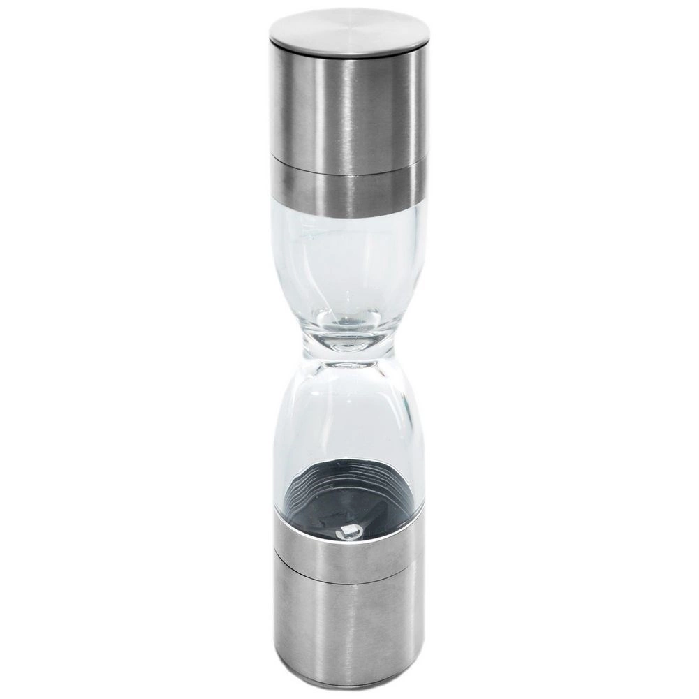 Elegant dobbelt krydderikværn i timeglasform, der kombinerer rustfrit stål, gennemsigtige beholdere og keramiske kværnmekanismer for præcis maling af både salt og peber. Tilbyder justerbar malingsgrad, to separate kamre og beskyttelseshætter mod spild af rester. En fantastisk hjælper i ethvert køkken og et stilfuldt indslag på bordet.
