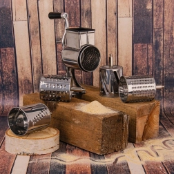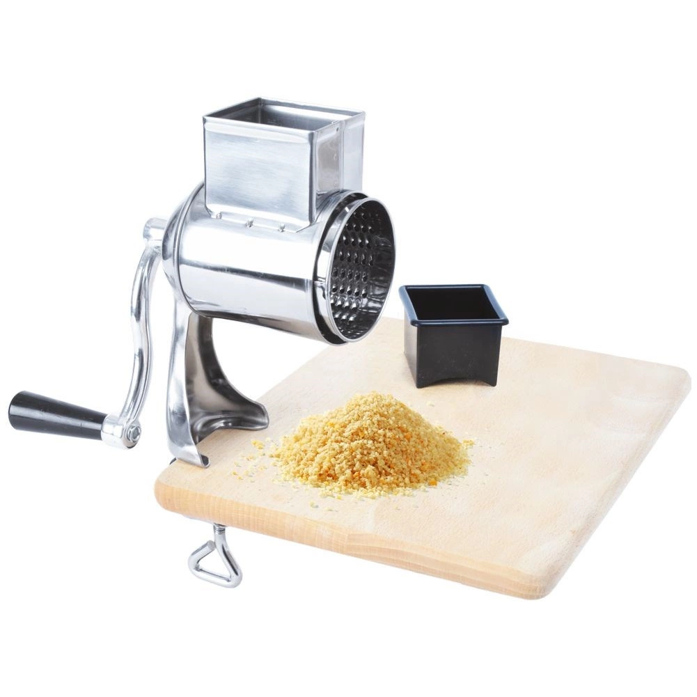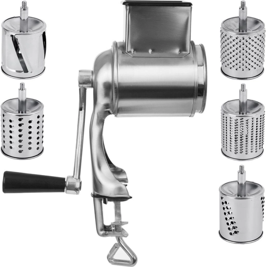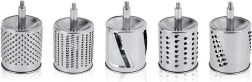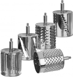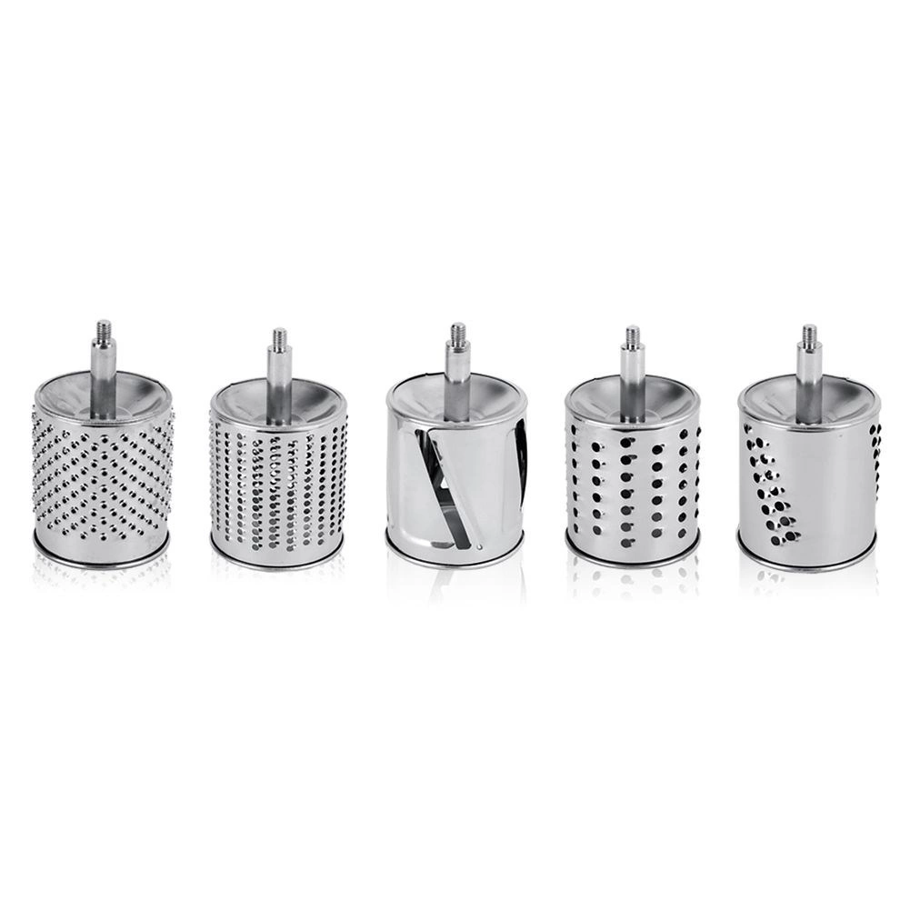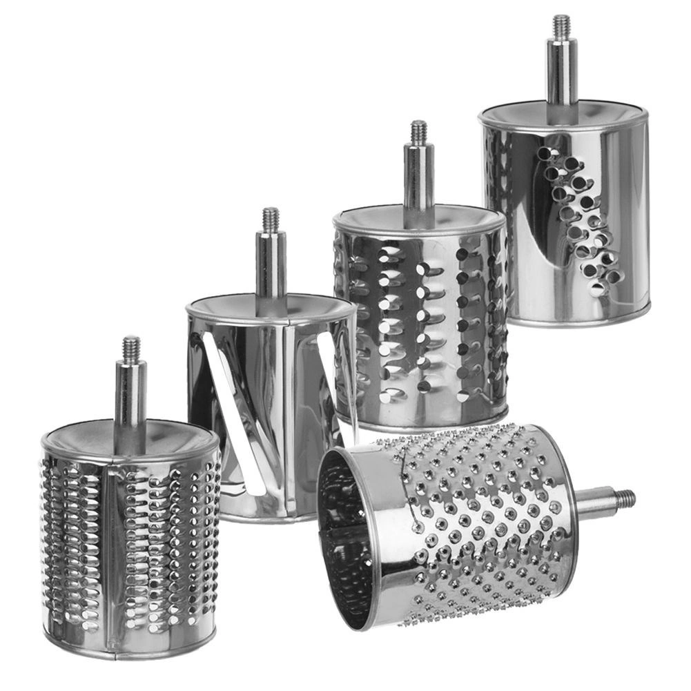 Sættet med 5 tromler i rustfrit stål dækker fin og grov rivning, skivning og knusning. Ideelt til ost, nødder, chokolade, grøntsager og frugt.