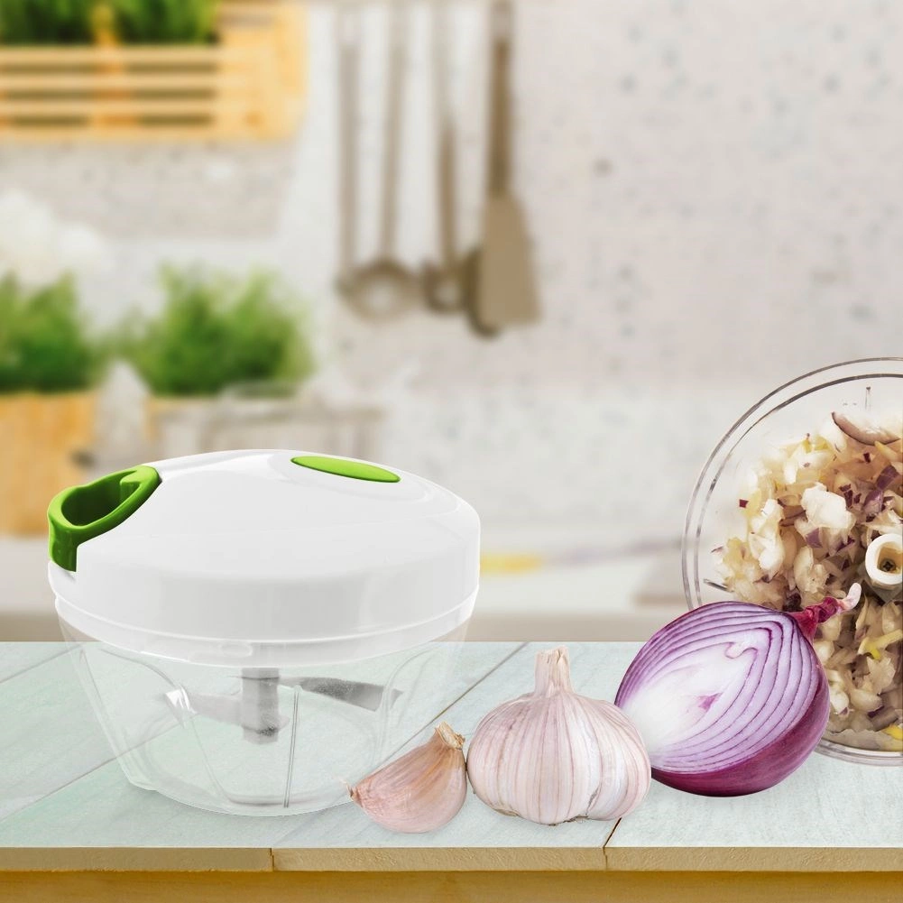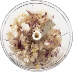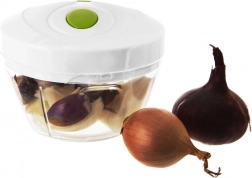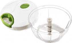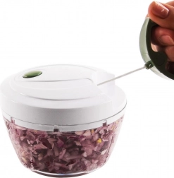 Praktisk køkkenhjælp til hverdagen – manuel hakker med trækmekanisme. Træk blot i håndtaget på låget, og på få øjeblikke kan du hakke, snitte og blande uden behov for elektricitet. Takket være den gennemsigtige beholder har du fuld kontrol over grovheden – antallet af træk afgør den endelige struktur.