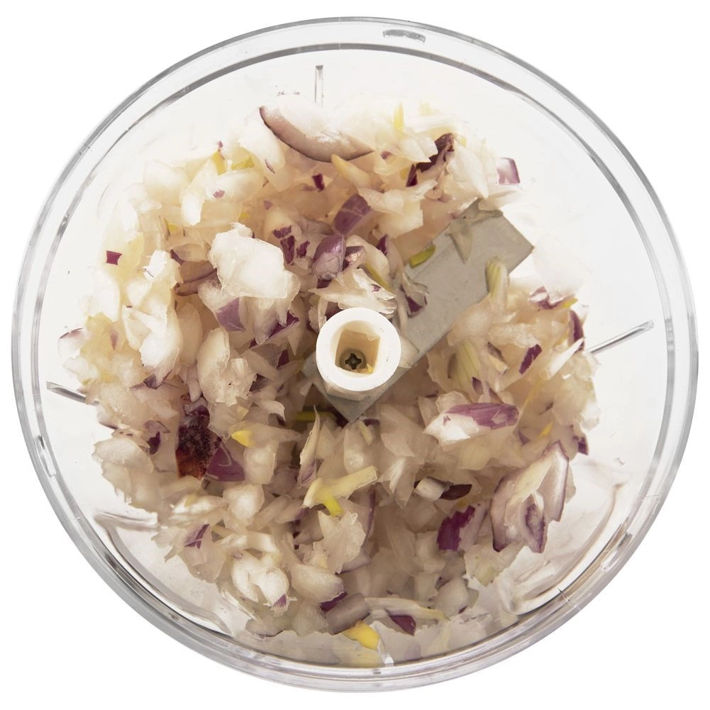 Den transparente beholder gør det muligt løbende at følge hakkegraden. Den skridsikre ring i bunden holder hakkeren sikkert på plads.