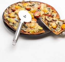 Oplev et pålideligt pizzahjul i rustfrit stål, som skærer pizzaer og fladbrød i perfekt lige stykker på få sekunder. Den robuste fuldmetal-konstruktion sikrer holdbarhed og lang levetid, mens det ergonomiske håndtag med fingerbeskytter giver et sikkert og behageligt greb.