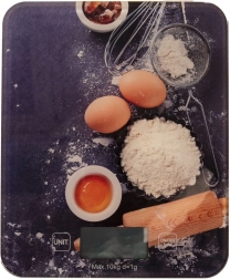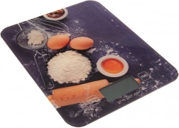 Praktisk og stilfuld køkkenvægt til præcis vejning af ingredienser. Takket være den læsbare LCD-skærm kontrollerer du nemt vægten af frugt, grønt, tørre og flydende ingredienser. Den flade konstruktion i hærdet glas med dekorativt motiv er let at vedligeholde og sparer plads i skuffe eller skab.