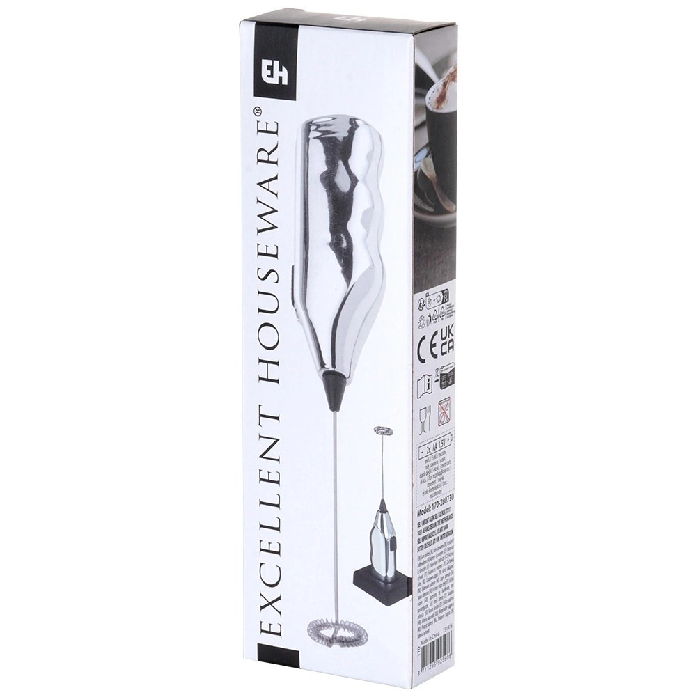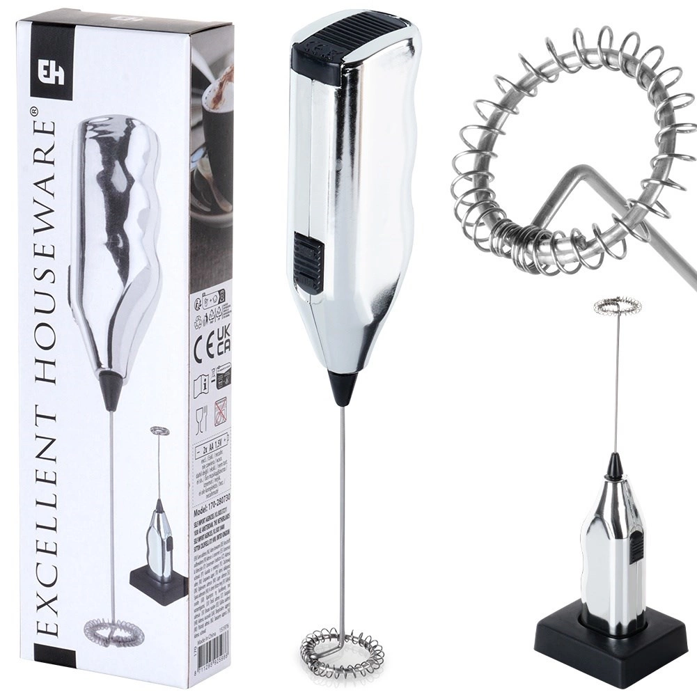 Kompakt elektrisk mælkeskummer på 20 cm med stativ for nem opbevaring. Tilbyder hurtig skumning af mælk til cappuccino, latte og varm chokolade, nem betjening med én knap og robust udførelse med piskeris i metal. Drives af 2× AA-batterier (medfølger ikke).