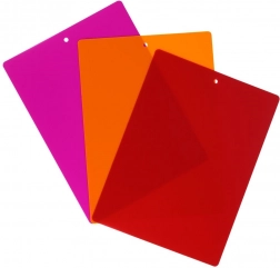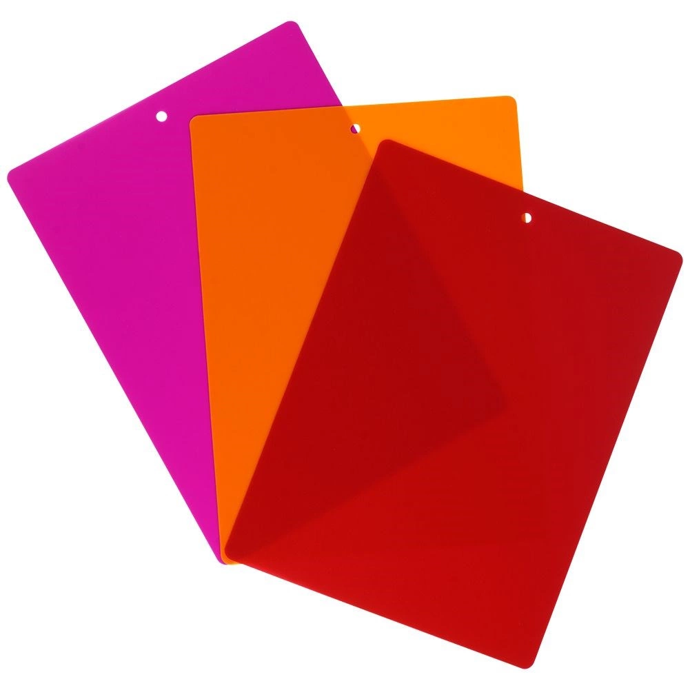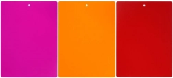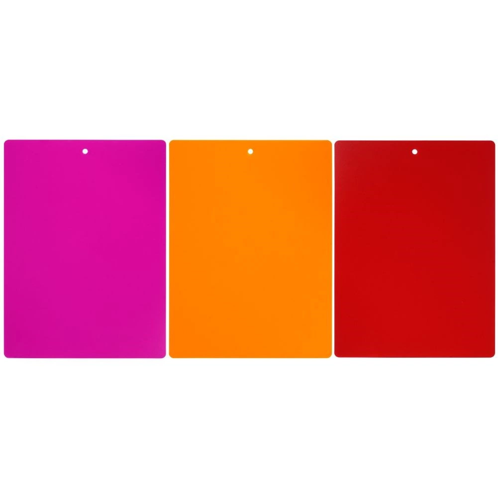 Med dette sæt af tre farveopdelte skæreunderlag får du lette, pladsbesparende og særdeles praktiske hjælpere i køkkenet. Den beskedne tykkelse på kun 0,6 mm gør, at underlagene nemt kan bøjes og giver bekvem overførsel af hakkede ingredienser direkte til gryde eller skål uden rod.