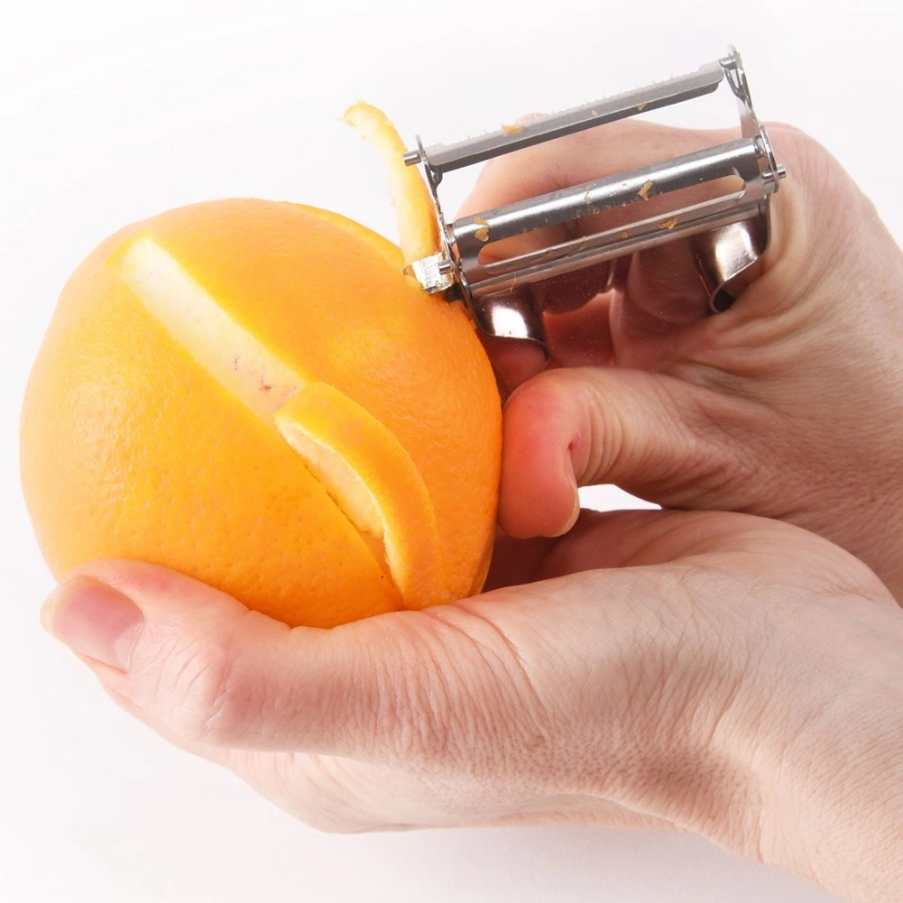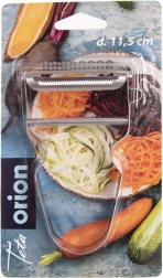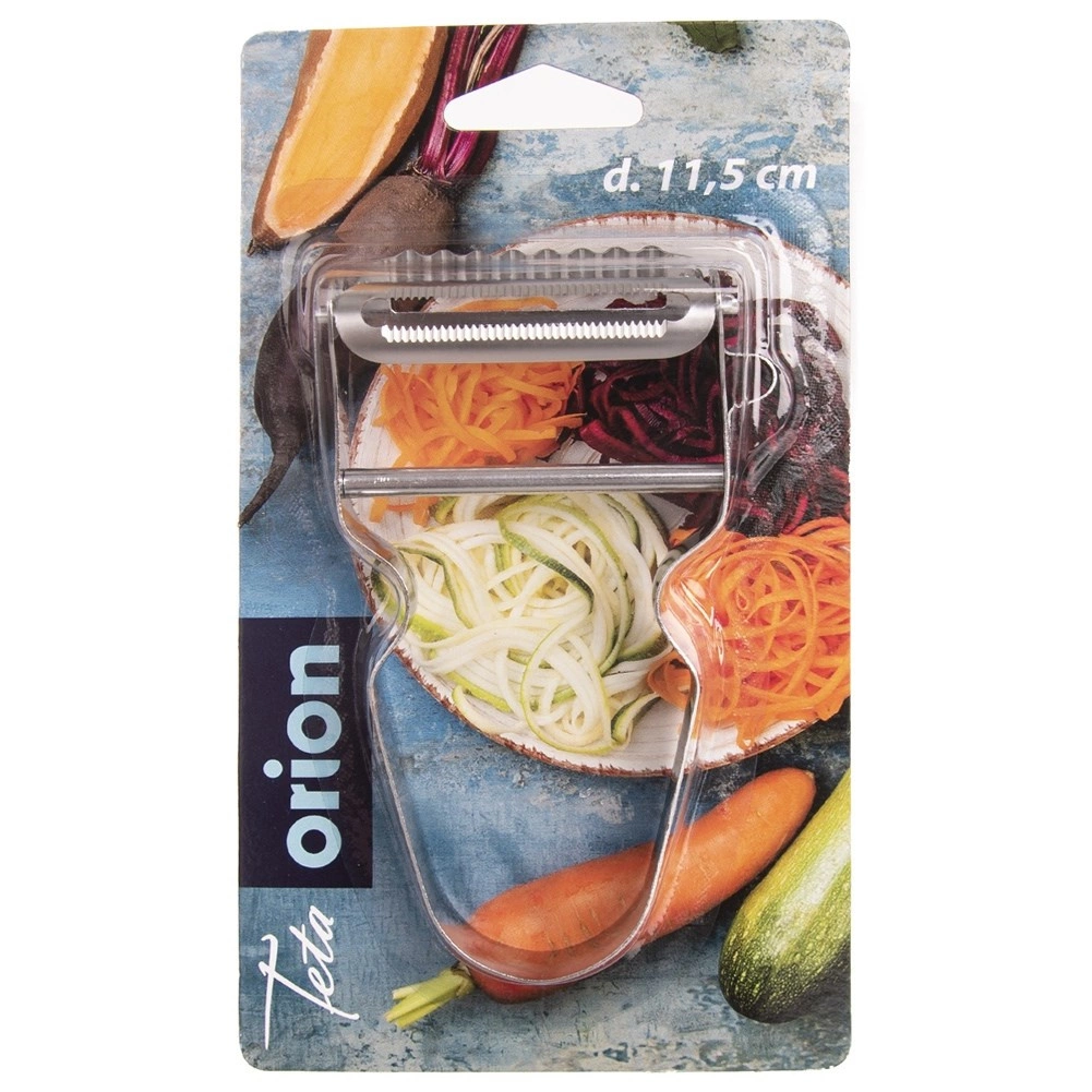 Denne alsidige skræller i rustfrit stål gør forberedelsen af grøntsager og frugt lettere – fra kartofler og æbler til tomater. De to skarpe blade klarer klassisk skrælning, skæring af tynde skiver samt dekorative bølgede snit og fine strimler til salater og pynt.