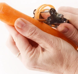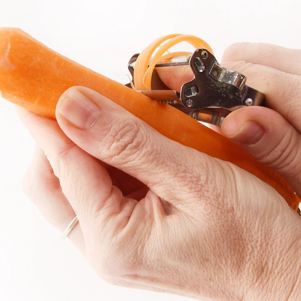 Kroppen i kvalitets rustfrit stål er holdbar og let at rengøre. Skrælleren har en sidepig til fjernelse af pletter og spirer samt til dekorativ rilleudskæring. Det ergonomiske design ligger godt i hånden, så arbejdet bliver hurtigt, sikkert og komfortabelt.