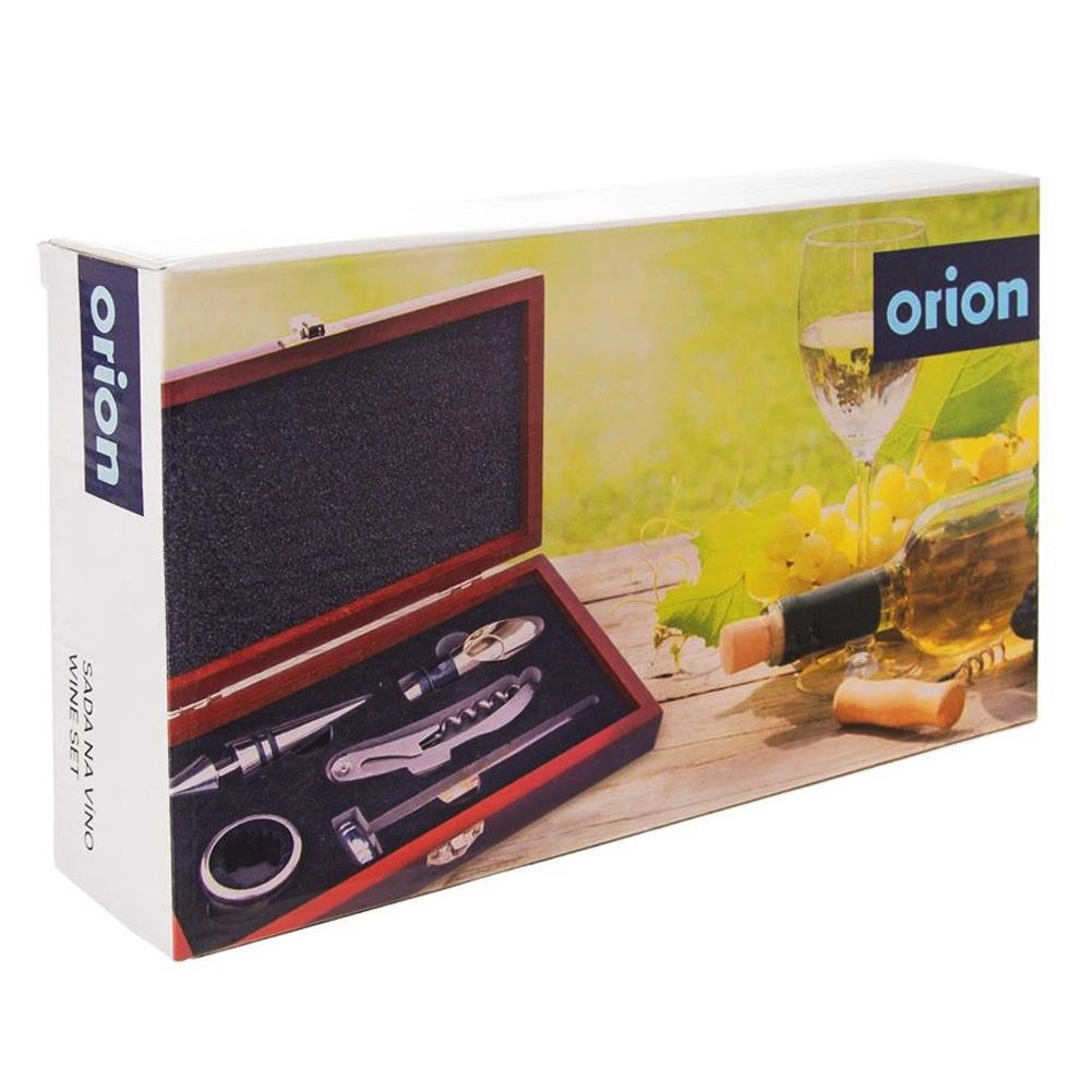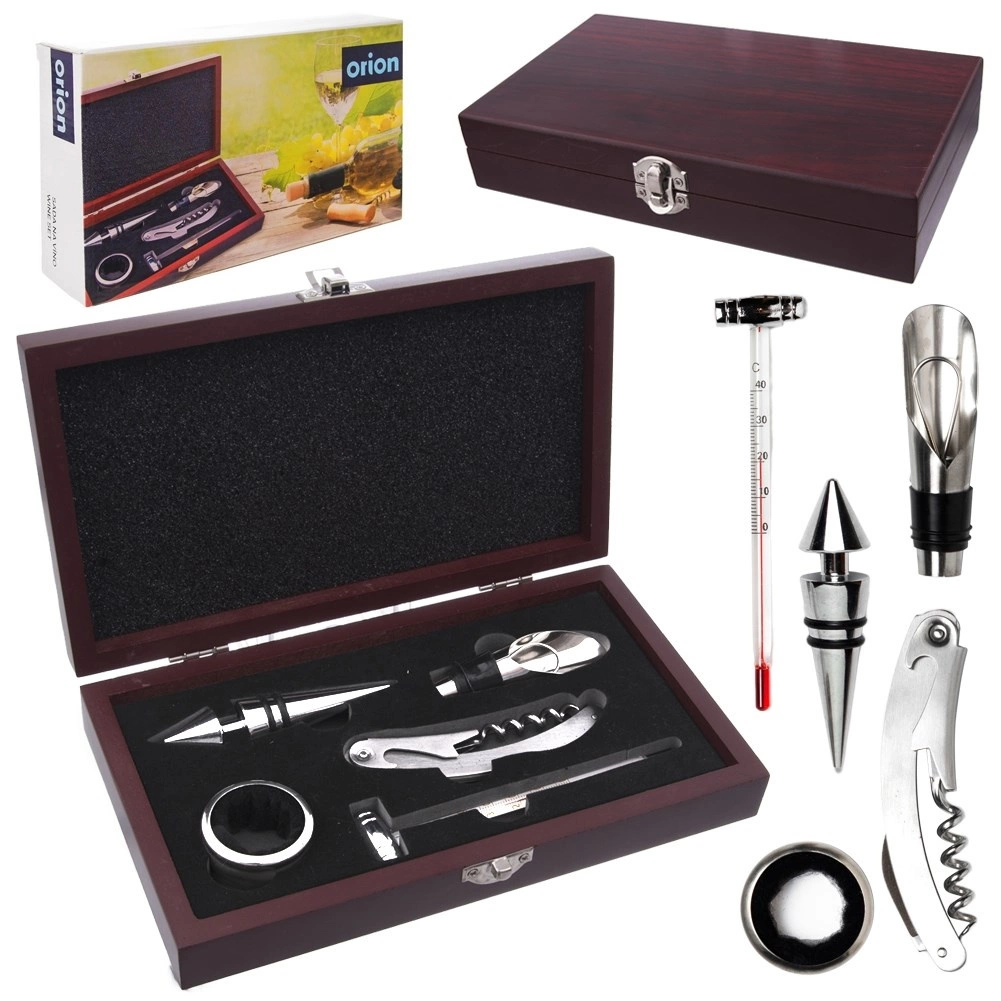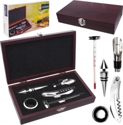 Elegant sæt til vin i en træboks tilbyder alt til nem servering: proptrækker med lille kniv, prop, skænkeindsats, drypring og termometer. Kvalitets rustfrit stål og gennemtænkt udførelse sikrer holdbarhed, ren ophældning uden dråber og korrekt vintemperatur. Det stilfulde træetui er ideelt som gave til vinelskere.