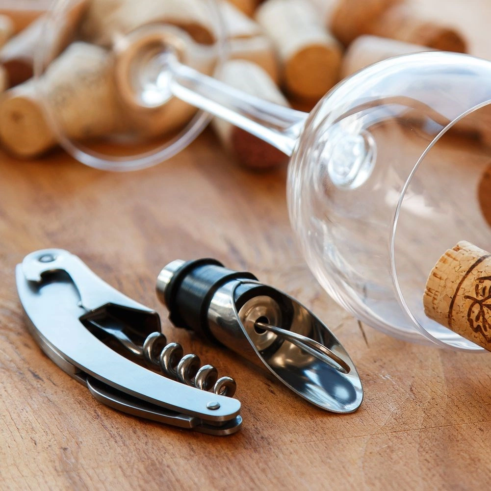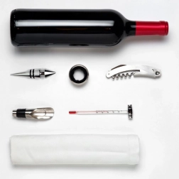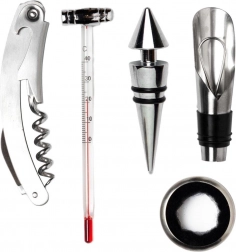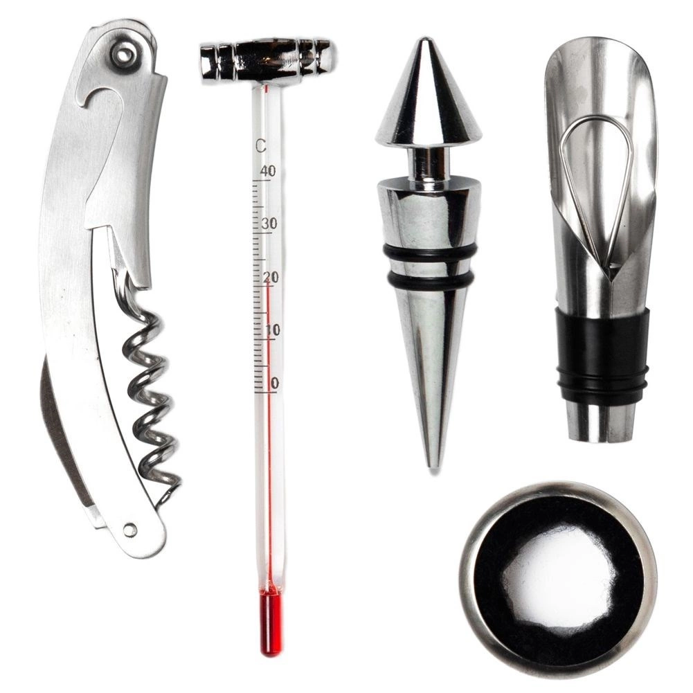 I pakken finder du alt, hvad du behøver: proptrækker med integreret kniv til nem fjernelse af folien, skænkeindsats til jævn og drypfri ophældning, prop til at bevare friskheden, drypring mod pletter og termometer til kontrol af den ideelle serveringstemperatur.