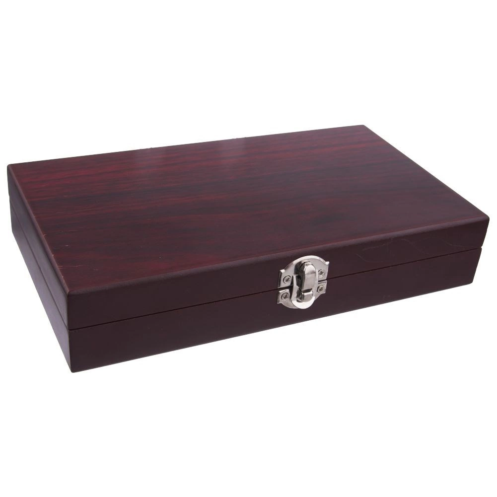Den solide trææske med mørk finish og metal-lukning beskytter tilbehøret og giver sættet et gavepræg.