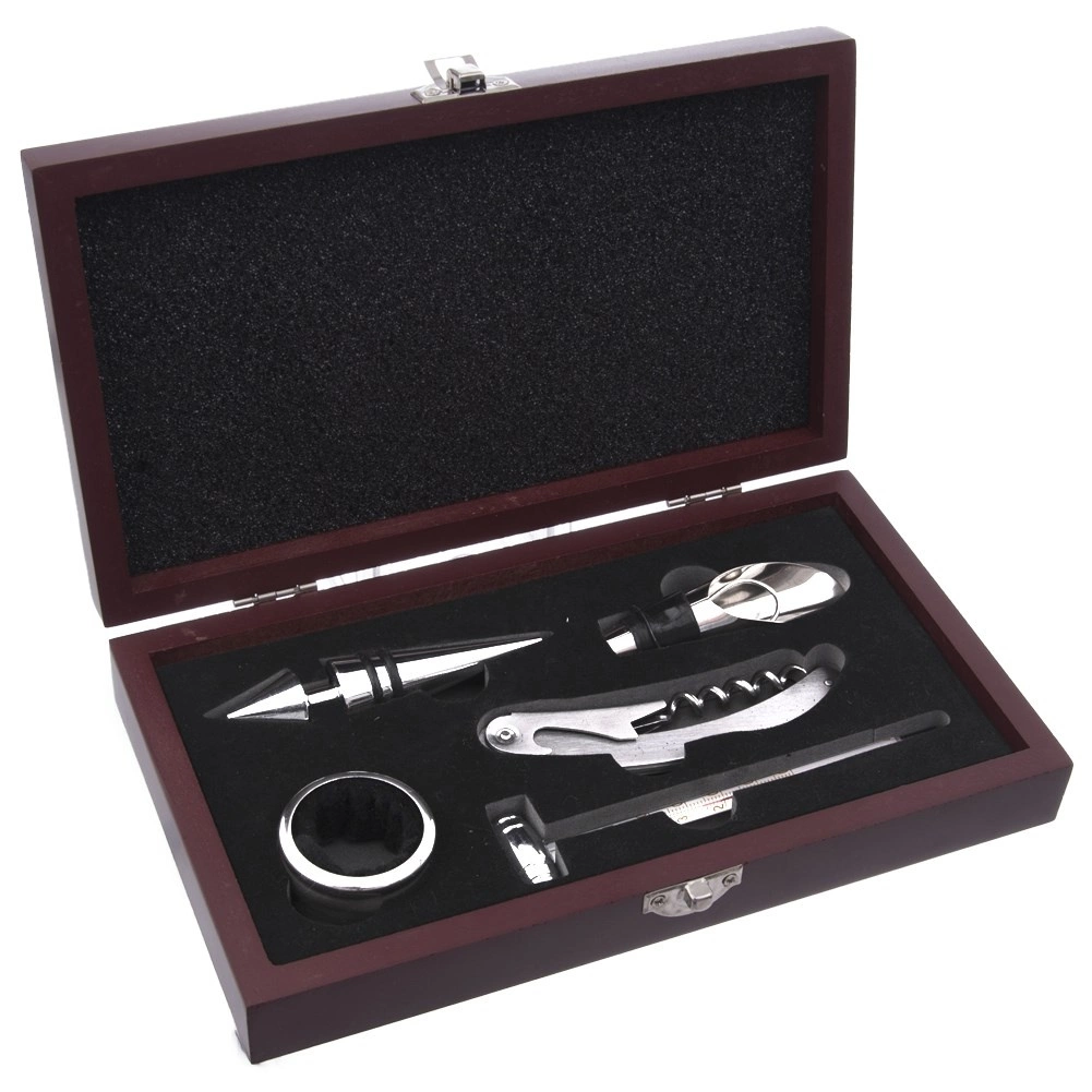 Dette komplette sæt med vintilbehør gør hver åbning af en flaske til et lille ritual. Værktøjer af robust rustfrit stål suppleret med et præcist glastermometer og praktiske tætningsdele sikrer komfort, renhed og en professionel præsentation. Opbevaringen i den mørke træboks beskytter værktøjerne og giver sættet et gaveagtigt udseende.