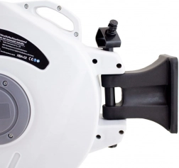 Den integrerede mekanisme med stop og slangefører sørger for hurtig og pæn oprulning uden sammenfiltring. Et kort ryk, og slangen trækkes automatisk ind.
