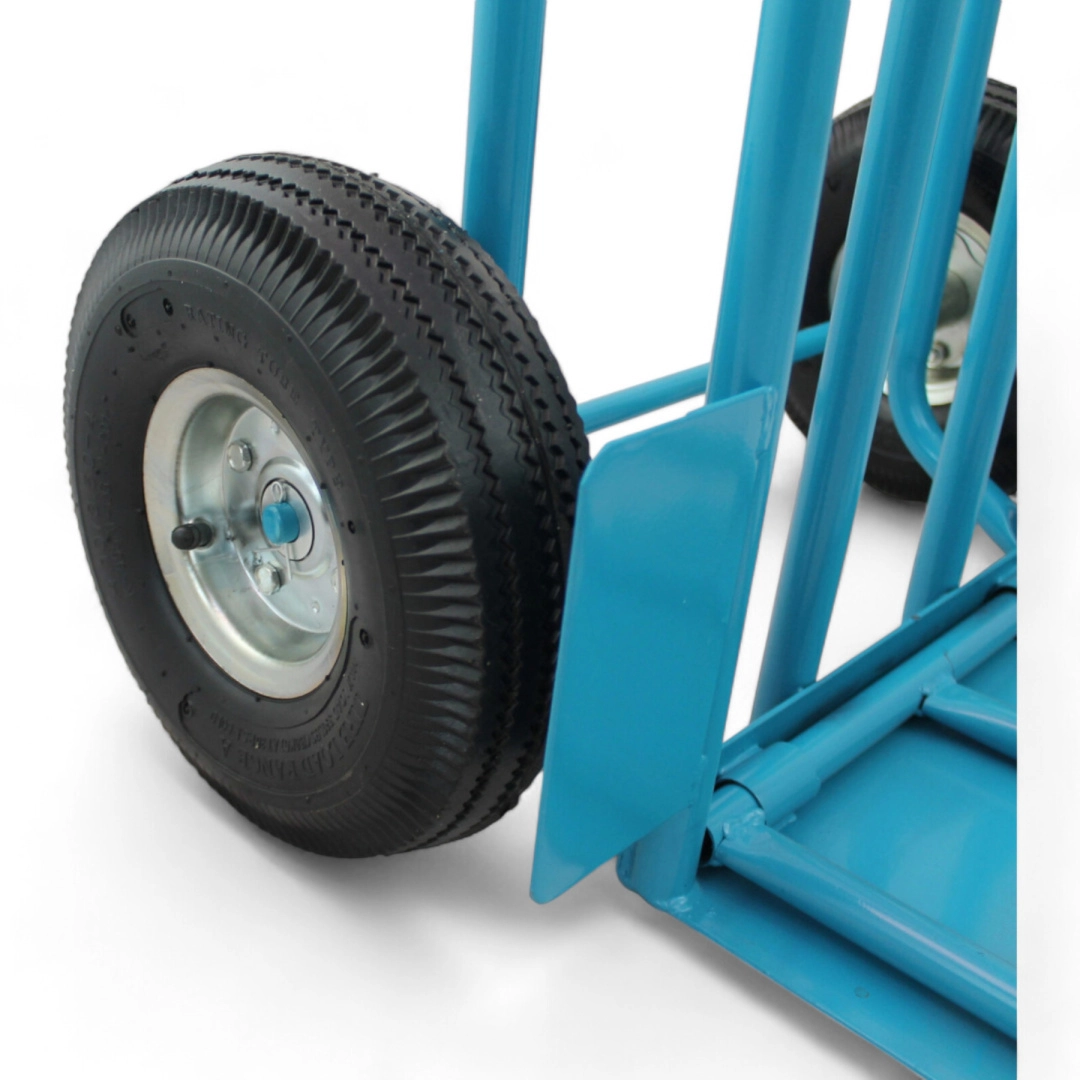 Store oppustelige hjul sikrer stabilitet, dæmper stød og gør det lettere at køre på belægning, grus og græs med fuld last.
