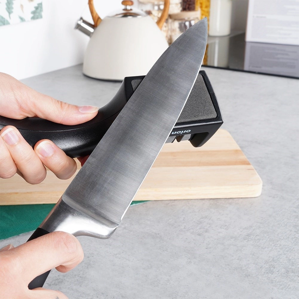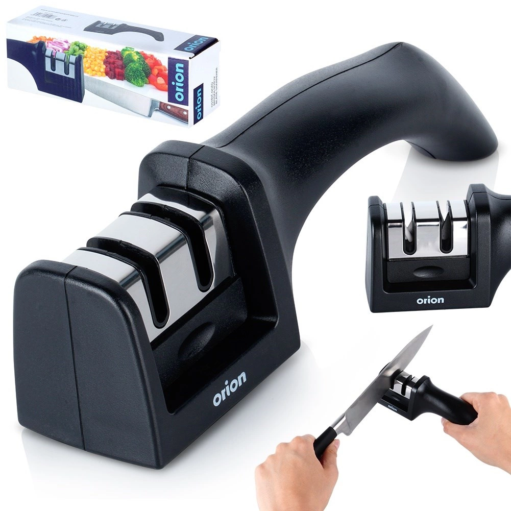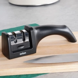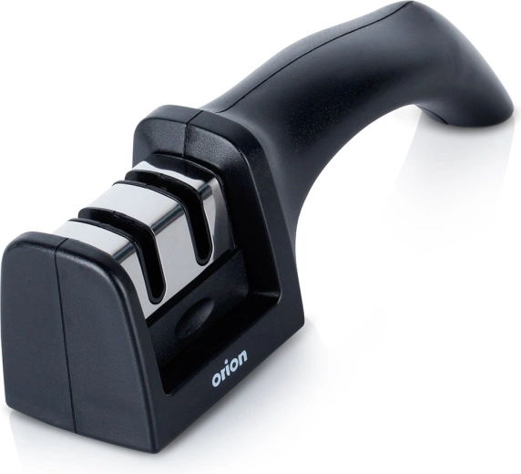 Forkæl dine knive med præcis pleje med den to-fasede ORION-knivsliber. Første trin med karbidhoved gendanner hurtigt en sløv æg, andet trin med keramisk indsats udglatter og polerer skånsomt for langvarig skarphed. Den stabile, skridsikre base og det formede håndtag sikrer et sikkert greb, selv ved højere tryk.