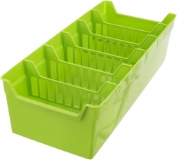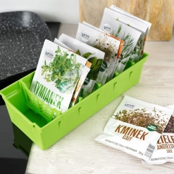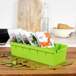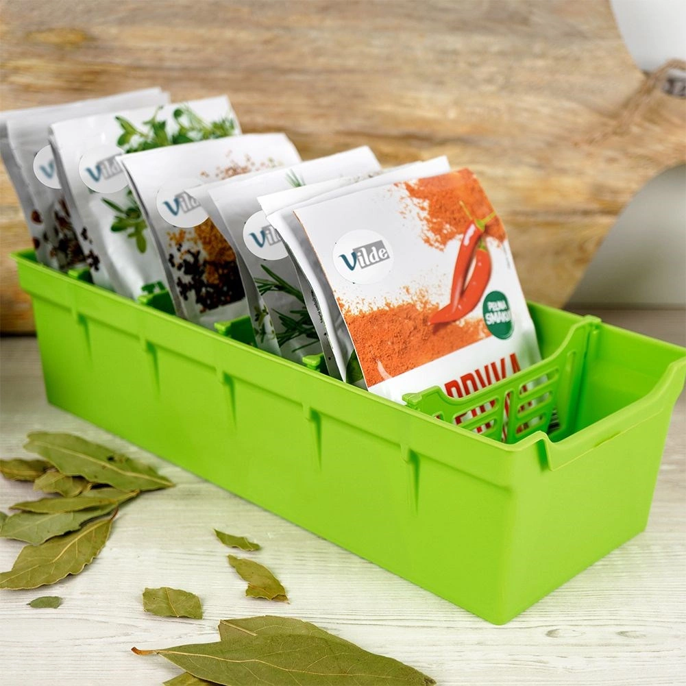 Organisér urter og krydderier overskueligt og elegant. Den grønne krydderi-organizer er ideel til opbevaring af krydderiposer – både åbne og lukkede. Indeni er der fem aftagelige skillevægge, som deler boksen i seks rum, så du får masser af plads og overblik til madlavningen i hverdagen.