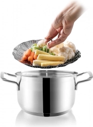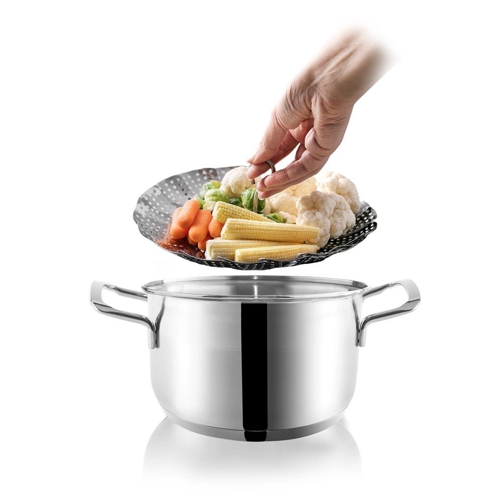Den sammenklappelige dampindsats i kvalitets rustfrit stål muliggør skånsom dampning, hvor maden bevarer smag, farve og næringsstoffer. Den justerbare diameter på 14–23 cm giver kompatibilitet med gryder i forskellige størrelser, så du kan tilberede alt fra grøntsager og fisk til dumplings.