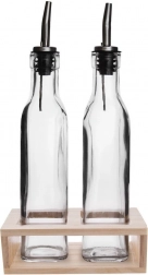 Elegant sæt med to glasflasker til olie og eddike med metalhældetud i et lyst træstativ. Hver flaske rummer 300 ml for nem påfyldning og servering. Takket være de smalle halsåbninger og metaldispenserne er ophældningen præcis, uden dryp, og du har altid fuld kontrol over indholdet. Det klare glas fremhæver smukt også krydderolier, og stativet holder alt overskueligt samlet både hjemme og i gastronomien.