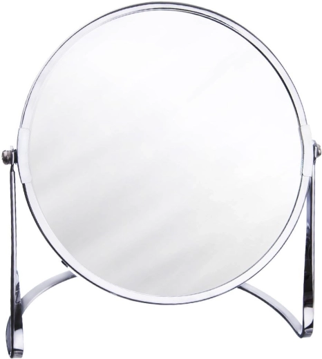 Elegant dobbeltsidet kosmetisk spejl på stander med sølvfarvet ramme er ideelt til makeup og daglig pleje. Det tilbyder klassisk visning og 2× forstørrelse, har en spejlfladediameter på 17 cm og virker stilrent og minimalistisk i enhver indretning.
