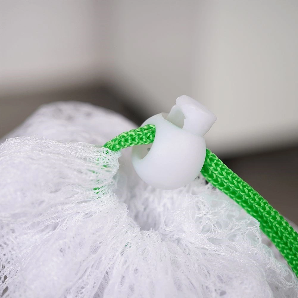 Plastik snorlåsen sikrer en pålidelig lukning af posen uden risiko for at beskadige tøj eller vaskemaskine.