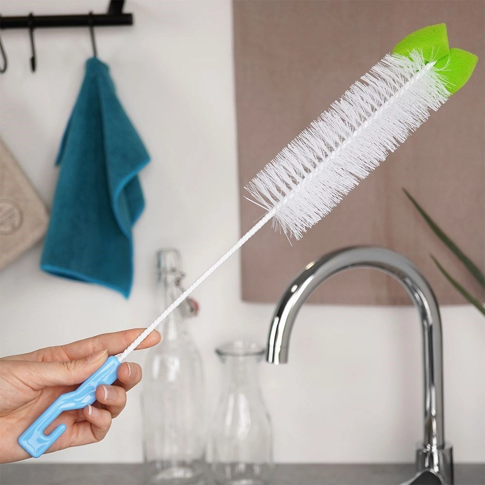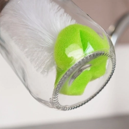 Denne lange og smalle flaskebørste er designet til nemt at nå ind i smalle flaskehalse og dybe beholdere. De tætte børster fjerner effektivt belægninger og snavs fra væggene, mens den bløde svampespids skånsomt efterrengør kanter og bund uden ridser.
