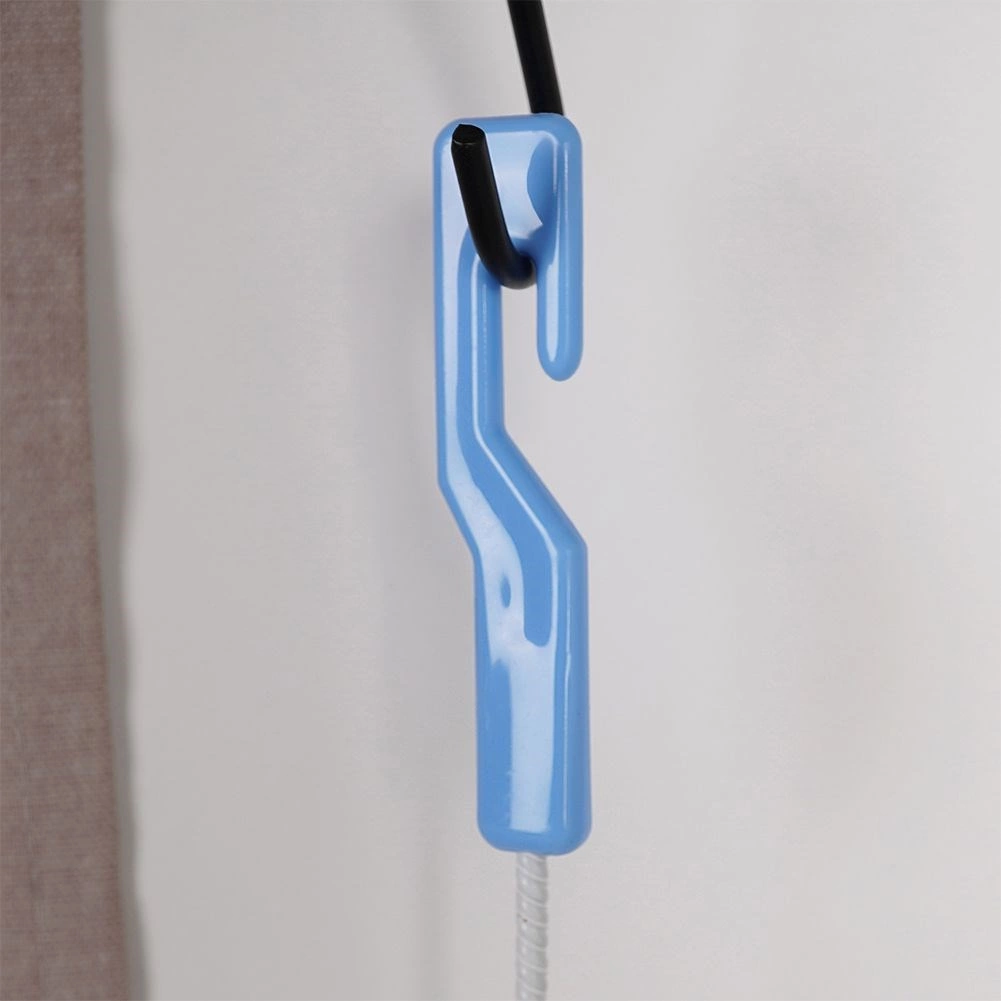 Ergonomisk blåt håndtag med krog til ophængning og tætte børster for effektiv rengøring.