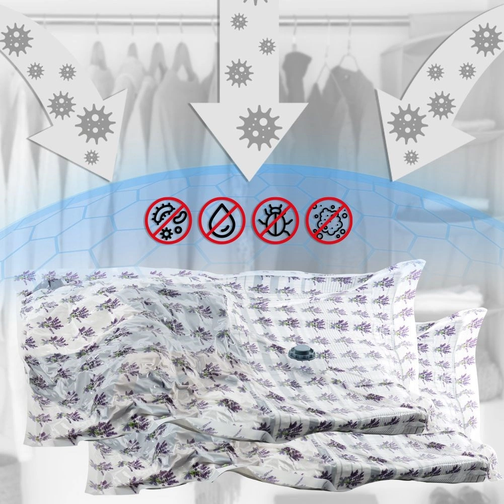 Vakuumposen er en fremragende løsning til sæsontøj, sengetøj og plysdyr. Den stærke, transparente film med lavendelmotiv og mild duft giver langvarig beskyttelse mod støv, snavs, fugt og skadedyr. Ved at fjerne overskydende luft får du et overskueligt og kompakt opbevaringsrum.