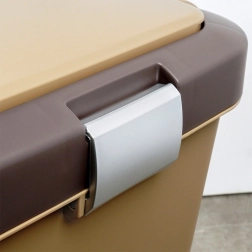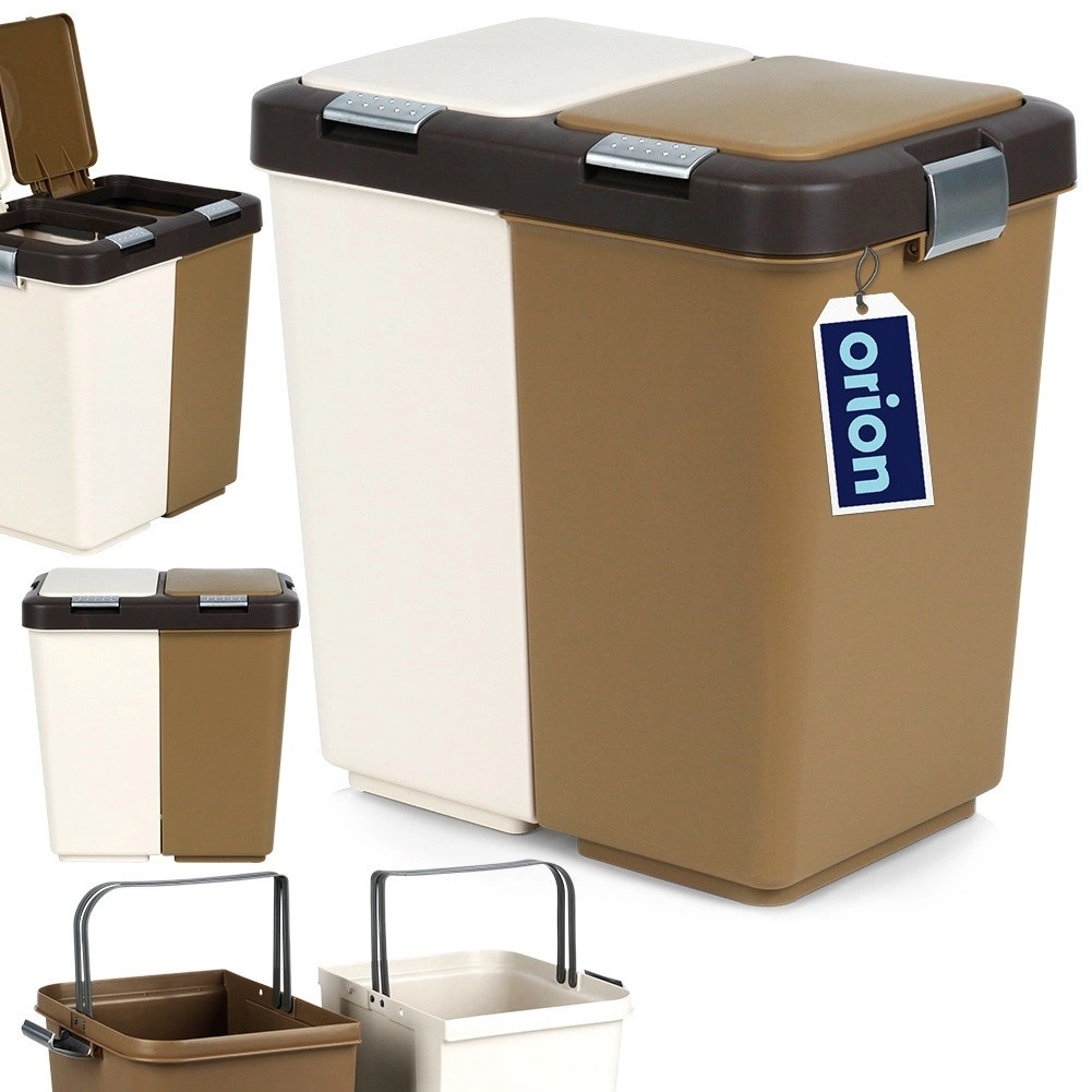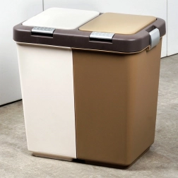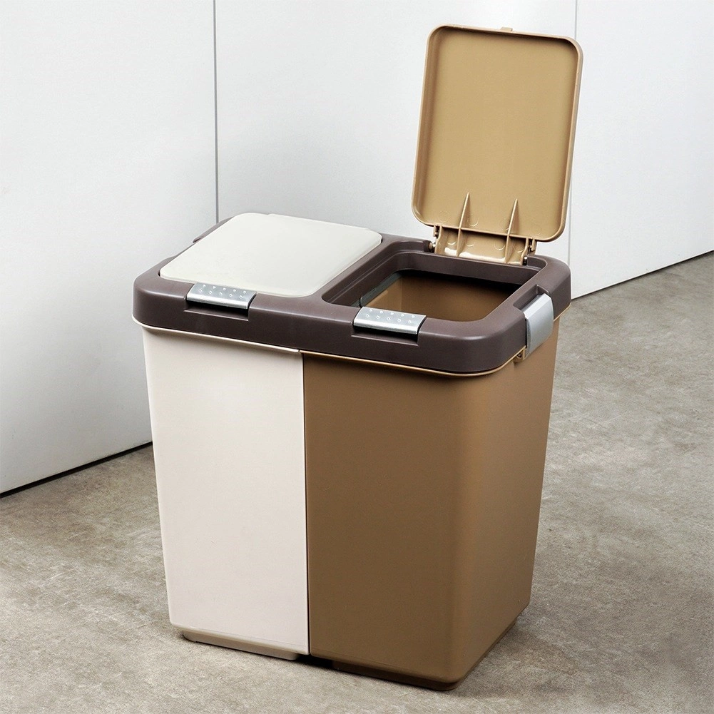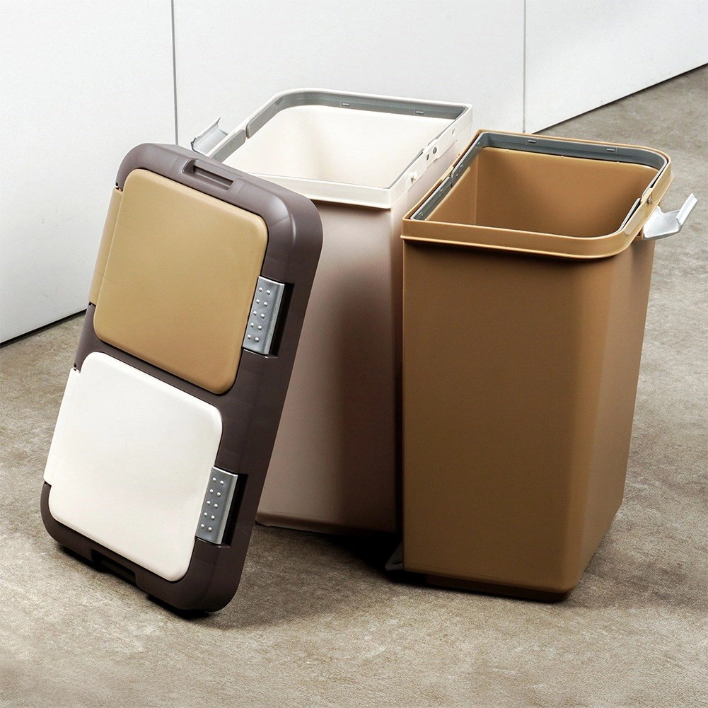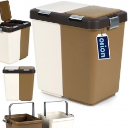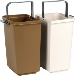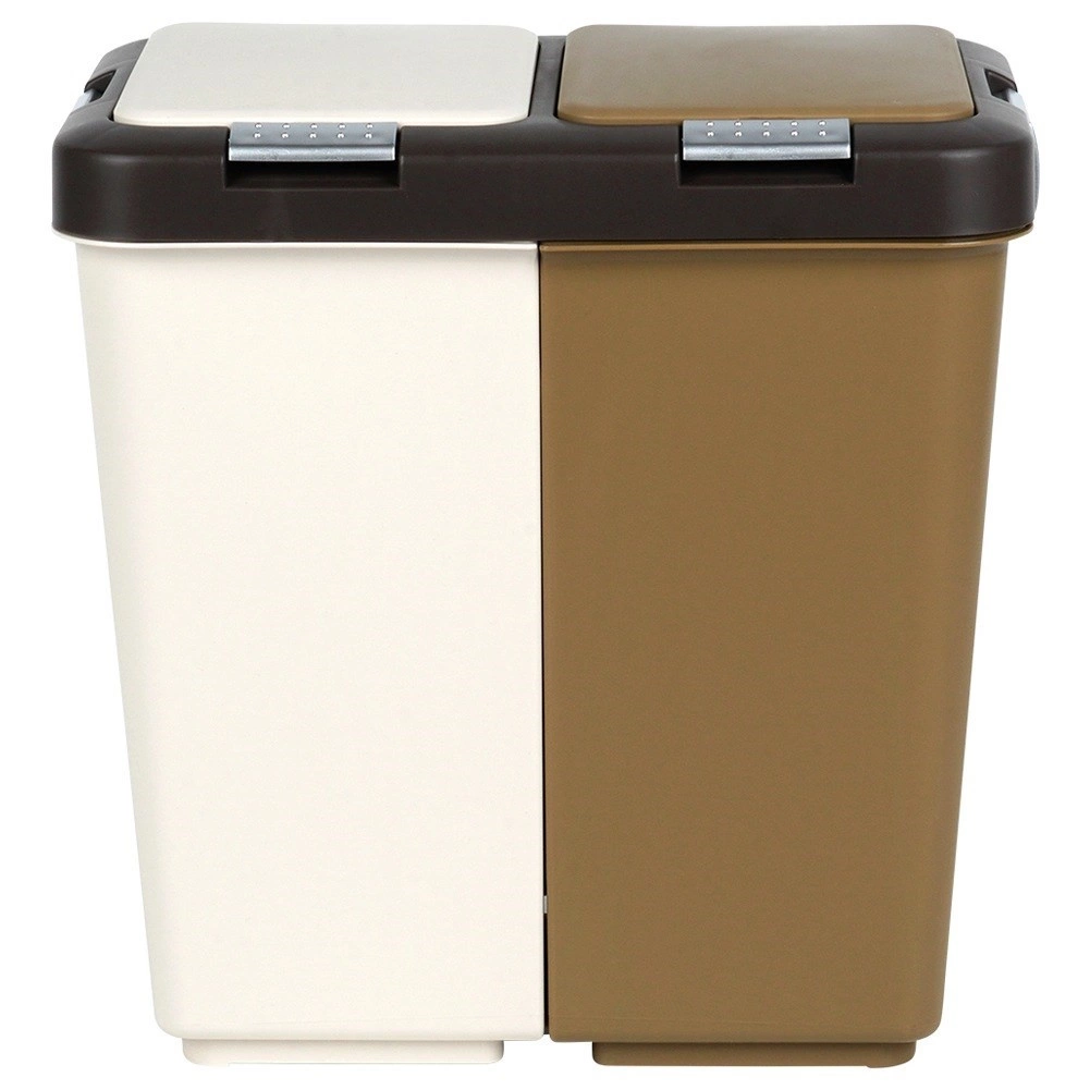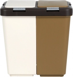 Spanden er fremstillet af robust plast i en kombination af hvid og brun, som passer ind i både moderne og mindre rum. Kompakte mål sparer mere plads end to separate spande og hjælper samtidig med at begrænse lugt takket være de lukkede låg.