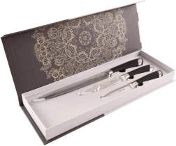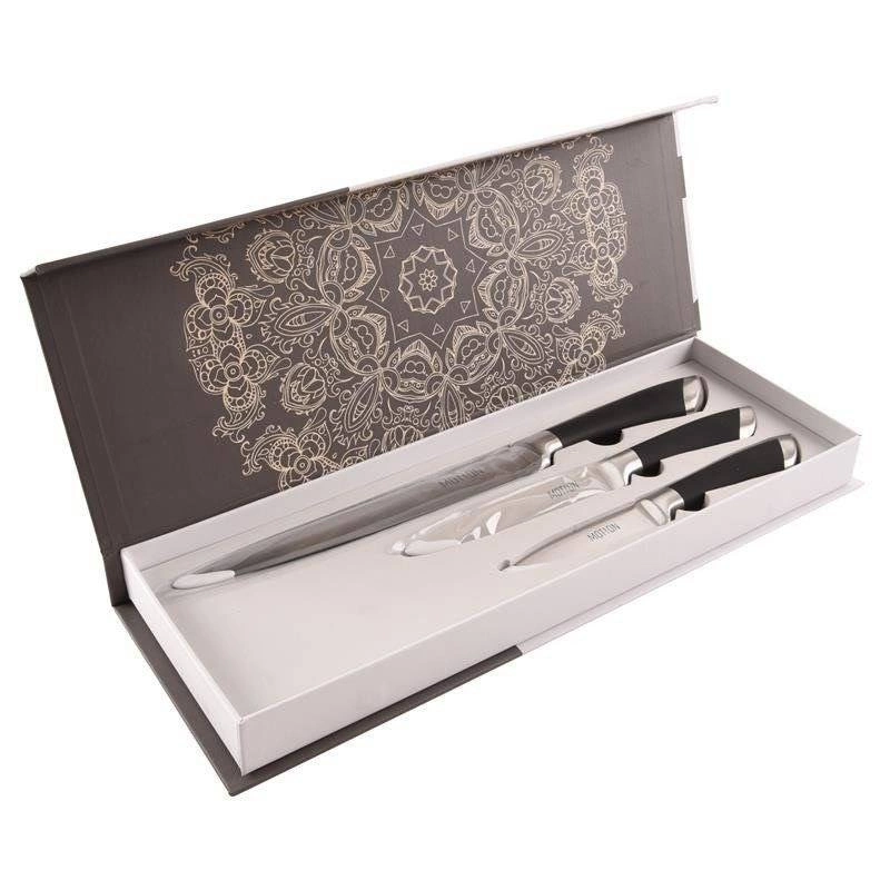 Praktisk sæt med tre køkkenknive MOTION af kvalitets rustfrit stål til præcis skæring af frugt, grøntsager, kød og brød. Tilbyder langvarig skarphed, ergonomiske skridsikre håndtag og alsidig anvendelse i både hjemmet og gastronomien.