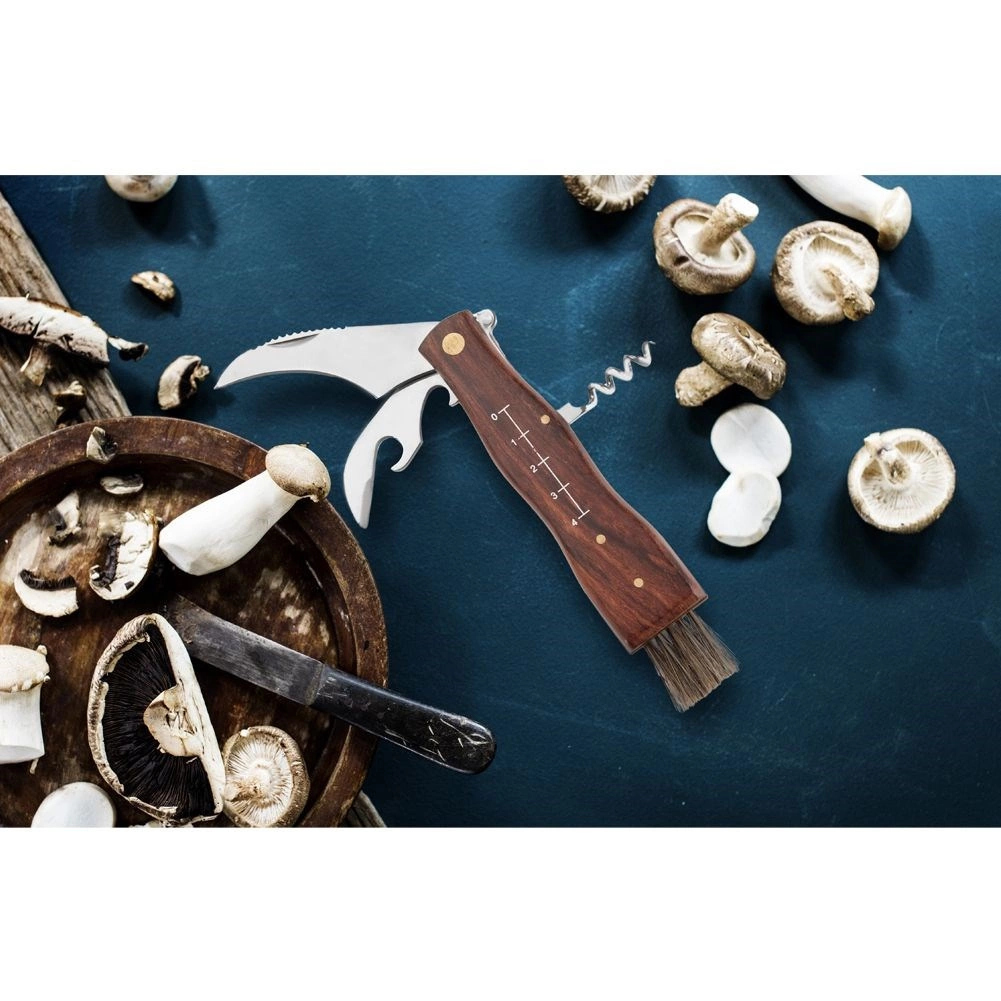 Det buede 8 cm lange blad i rustfrit stål gør det nemt at skære og gribe svampe og muliggør en første grovrengøring direkte i felten.