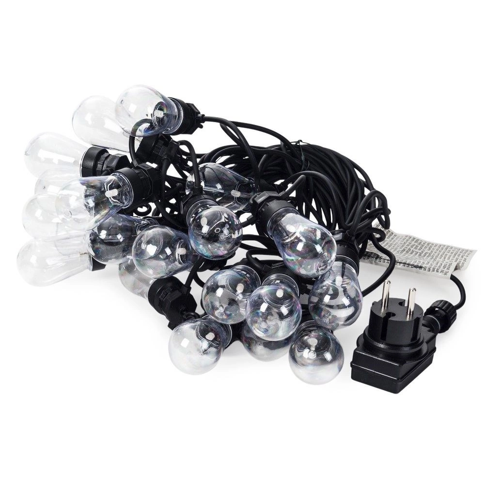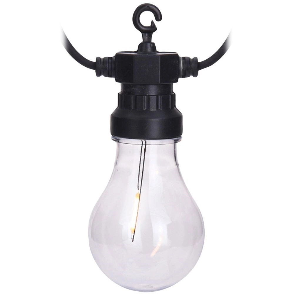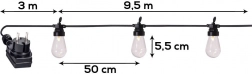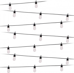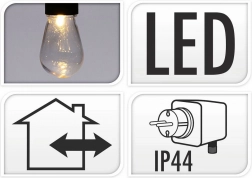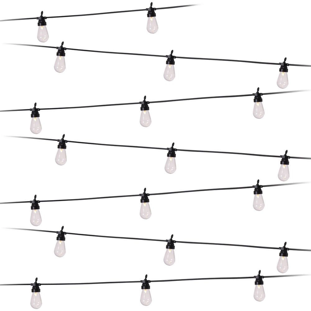 Hver fatning har en praktisk krog til hurtig og sikker montering på pergola, hegn eller trægrene. Det lette og nemt vedligeholdte sæt giver en jævn lysfordeling med 50 cm mellem pærerne og en tilstrækkelig 3 m tilslutningsledning.