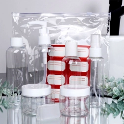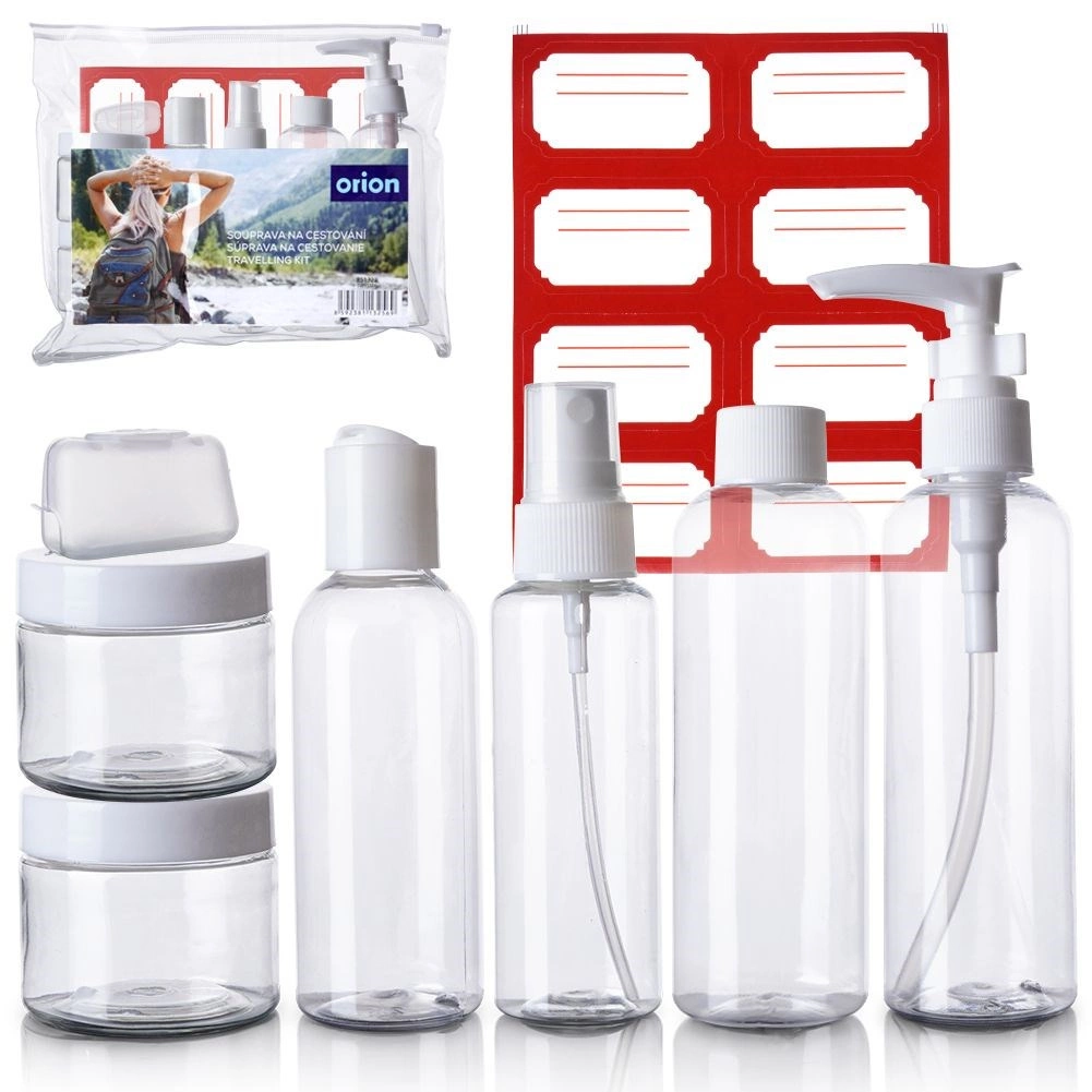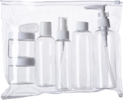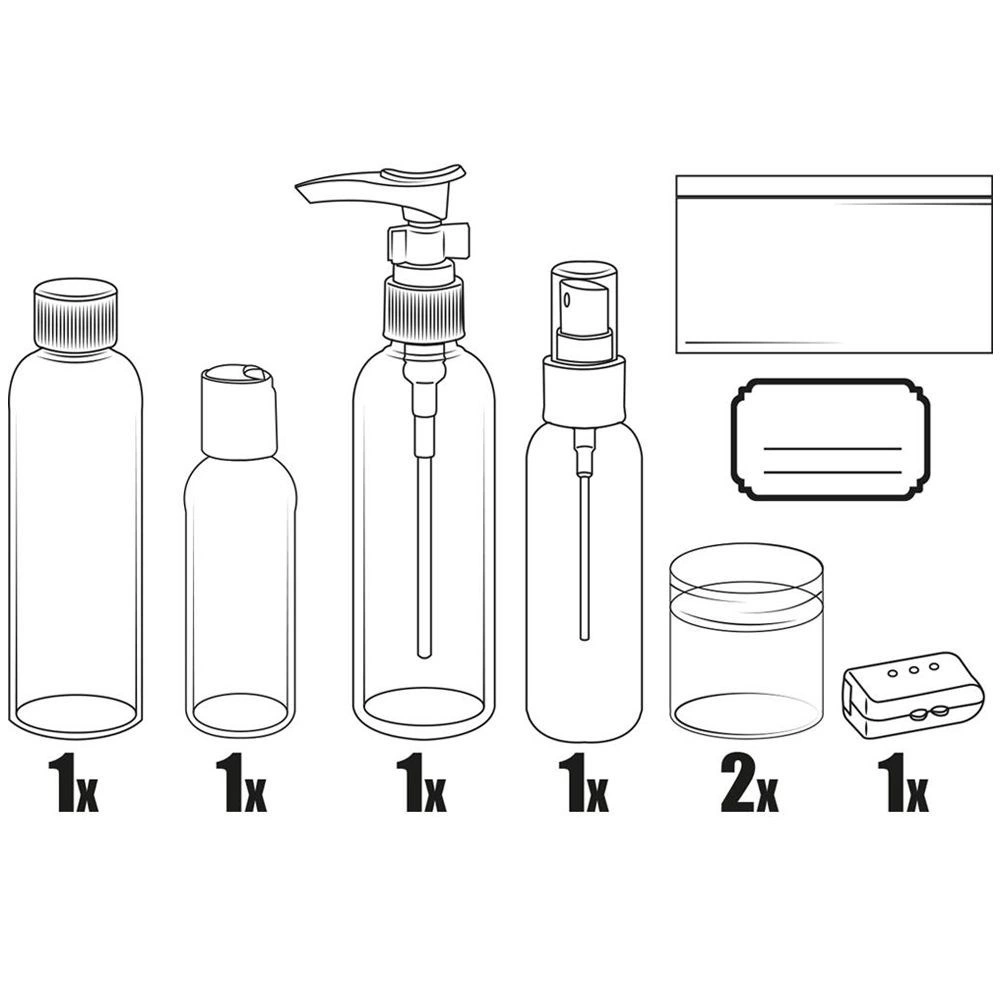 De holdbare plastflasker og -dåser er lette at rengøre og kan genopfyldes. Brug dem til shampoo, brusegel, creme, bodylotion og desinfektion. De medfølgende etiketter gør hurtig mærkning mulig, mens lynlåspungen holder alt samlet og beskyttet mod spild.