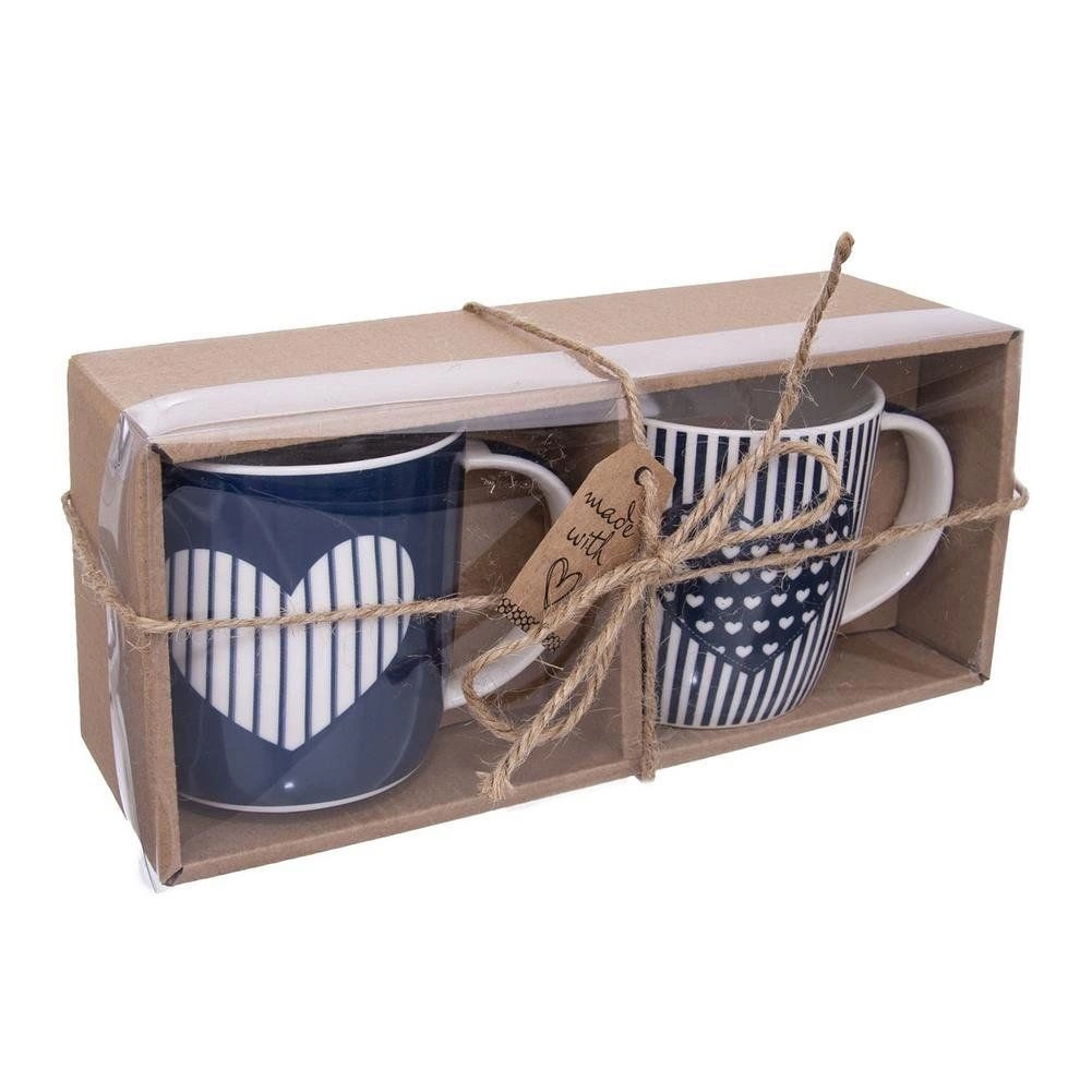 Et stilfuldt sæt med to porcelænskrus på 390 ml vil glæde både kaffe- og teelskere. Krusene med hjerte-motiv i blå-hvid farvekombination har et behageligt håndtag, er velegnede til opvaskemaskine og mikrobølgeovn, og takket være den kvalitets porcelænskonstruktion tåler de daglig brug.