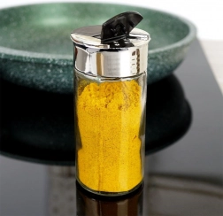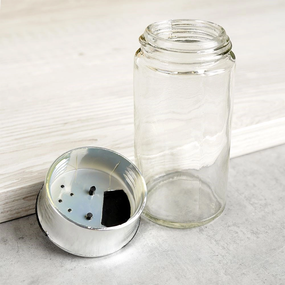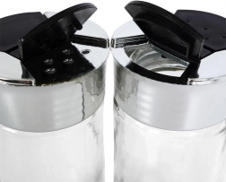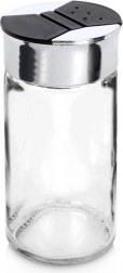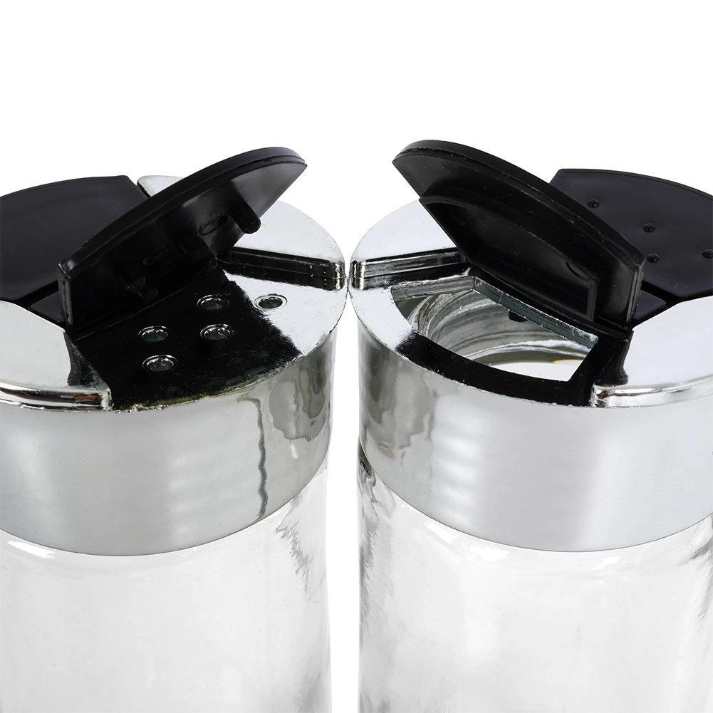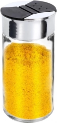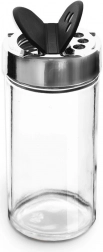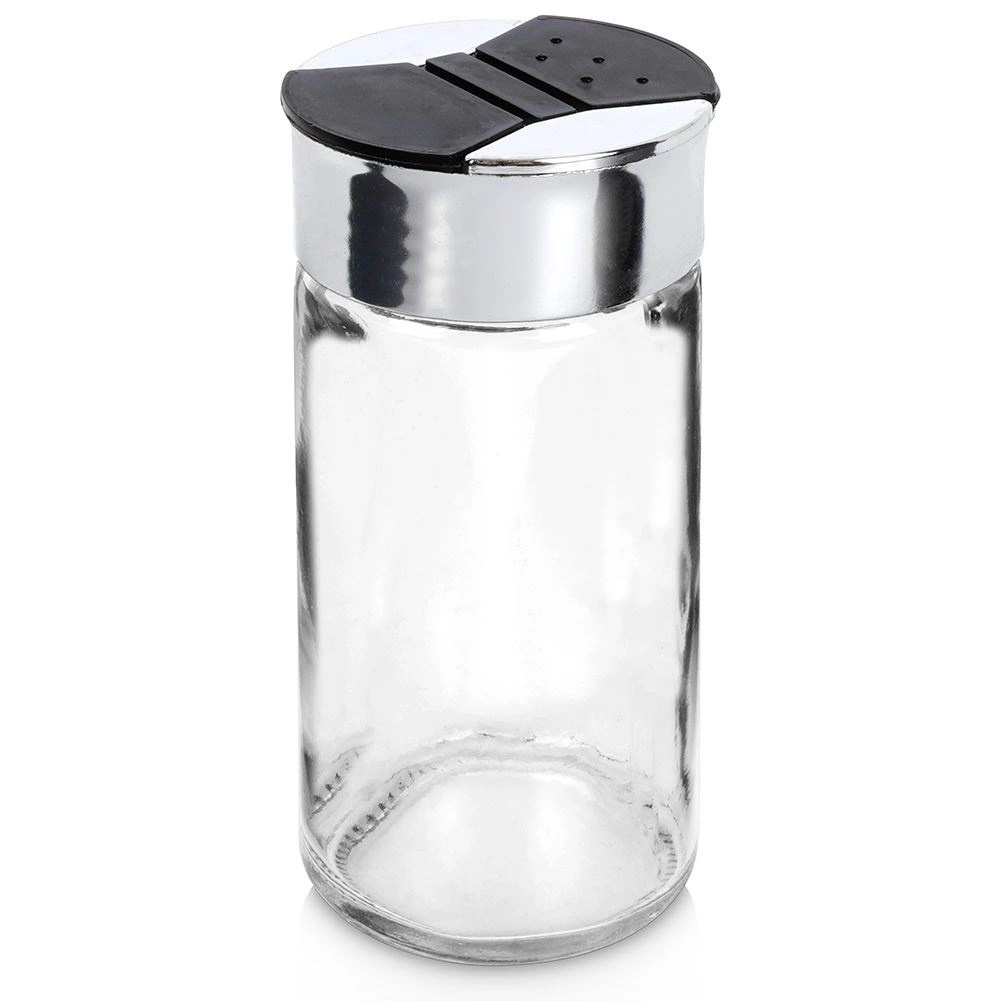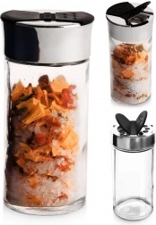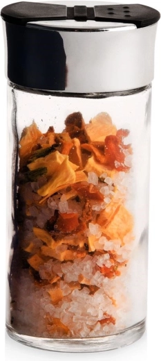 Alsidig krydderidåse af klart glas med metalblank ring og sort dobbelt flip-låg, som giver nem og præcis dosering af krydderier. To typer åbninger gør det muligt at strø både fine og grovere krydderier uden risiko for overdosis. De lukkelige klapper beskytter indholdet mod fugt og hjælper med at bevare friskhed og duft.