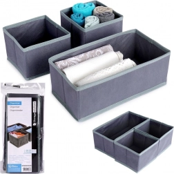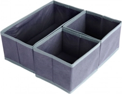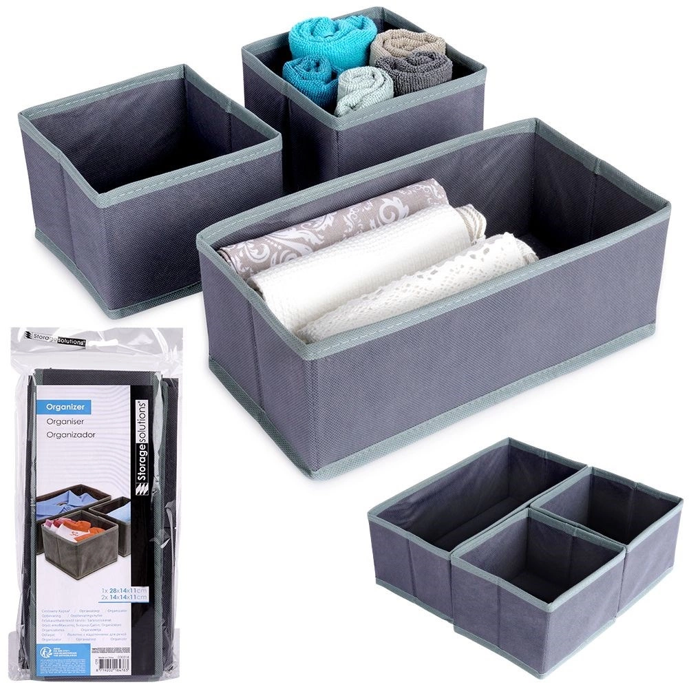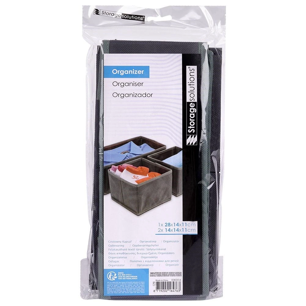 Sættet med skuffeorganisatorer giver en hurtig løsning til overskuelig opbevaring af småting i soveværelse, garderobe og badeværelse. To mindre kvadratiske bokse og én større rektangulær boks passer i de fleste standardskuffer og gør det nemt at sortere undertøj, modeaccessories eller kosmetik. Den bløde tekstiludførelse med forstærkede kanter holder formen og sparer samtidig plads.
