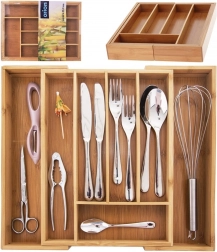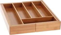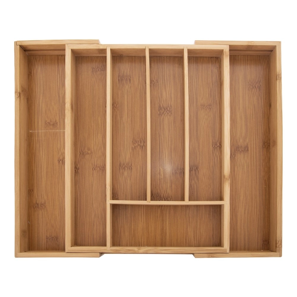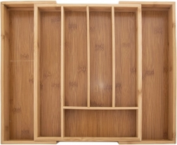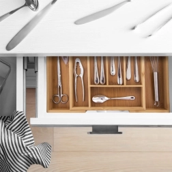 Bambustræ er modstandsdygtigt over for fugt og deformation, absorberer ikke lugte og er let at rengøre. Organizeren tilbyder 5 til 7 rum alt efter udtræk, så du kan tilpasse indretningen til dine behov – fra gafler og skeer til skrællere, piskeris eller køkkensakse.
