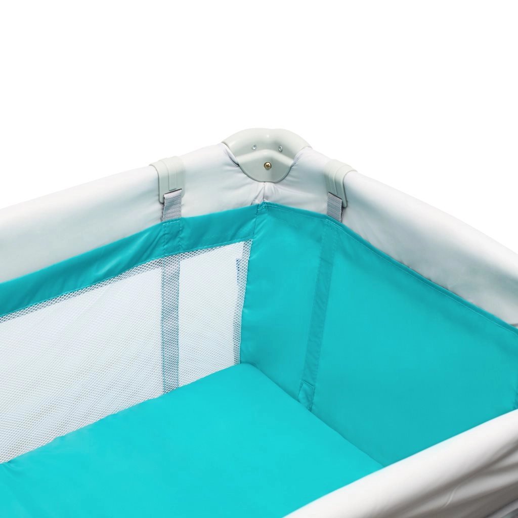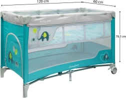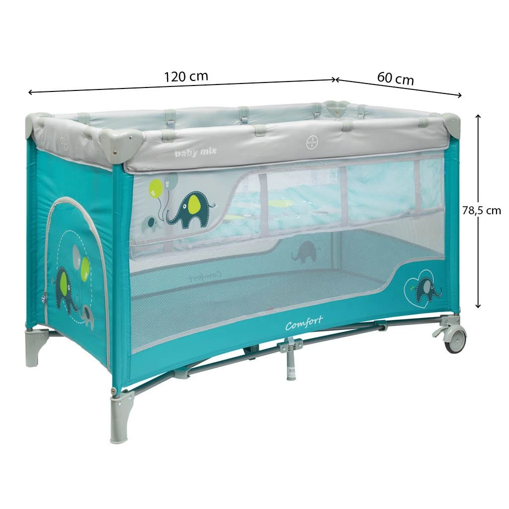 For nem håndtering er den udstyret med hjul med integreret bremse, lynlåsåbning til leg og nem adgang samt en blød, sammenklappelig madras i størrelsen 120 × 60 cm. Det moderne design med glade motiver vil glæde både børn og forældre. Produktet opfylder de strenge europæiske sikkerhedsstandarder EN 716.