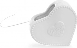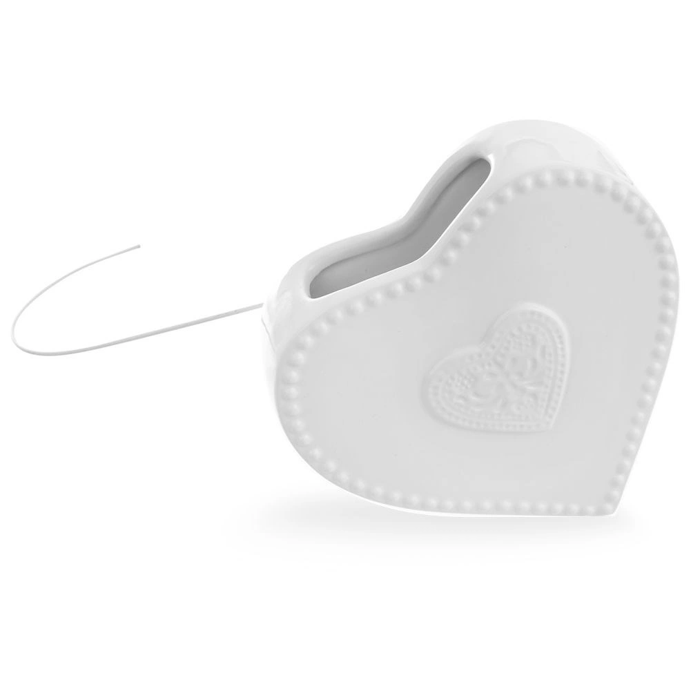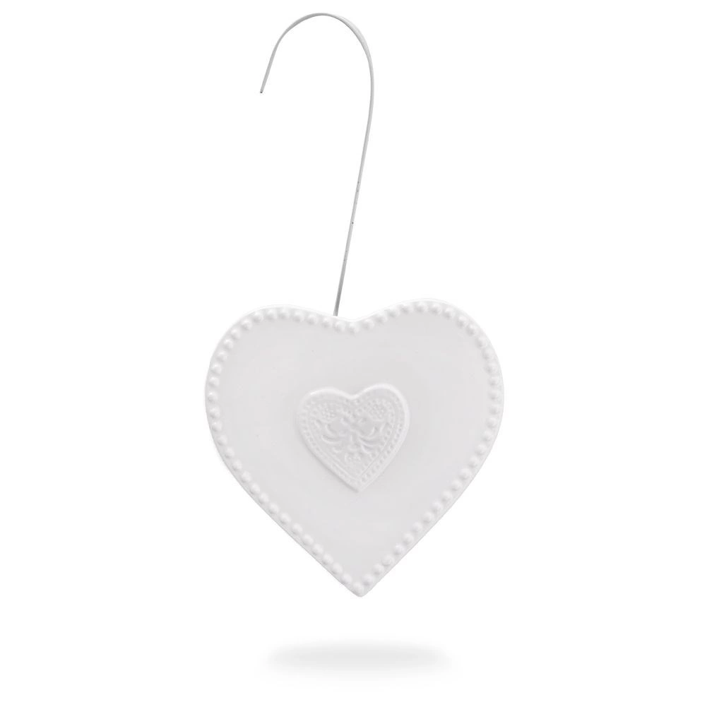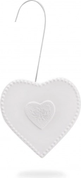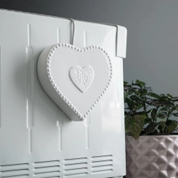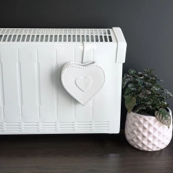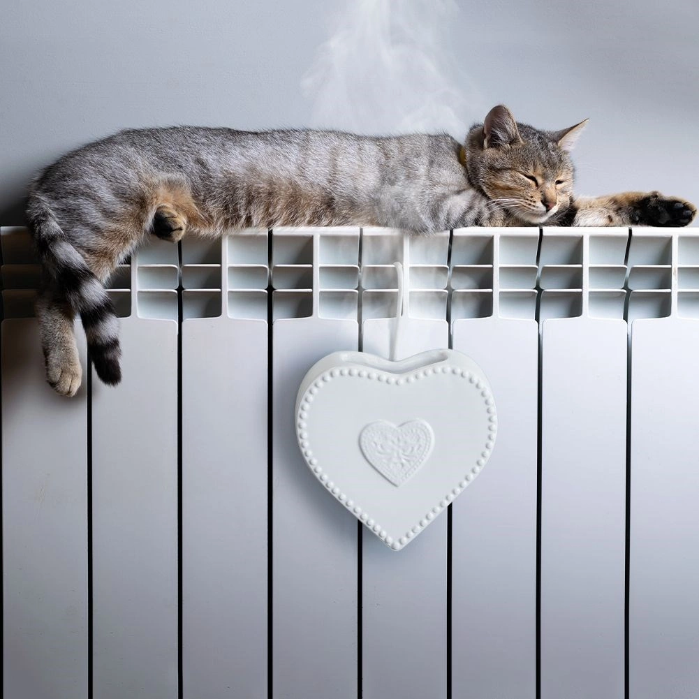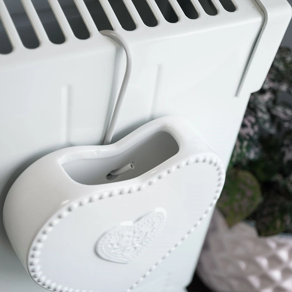 Denne hvide keramiske radiator-luftfugter med fint hjerterelieff er en praktisk løsning mod tør luft i opvarmningsperioden. Fyld den blot med vand og hæng den på radiatoren med metalkrogen – vandet fordamper langsomt og forbedrer indeklimaet i rummet.