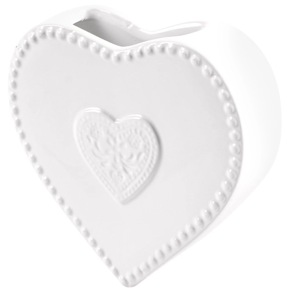 Hvid glasur, perlekant og et reliefmotiv af et hjerte giver både radiatoren og rummet et elegant udtryk.