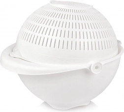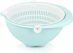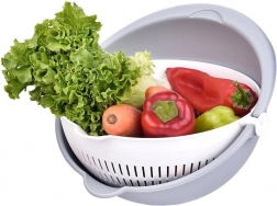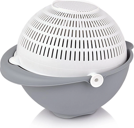 Oplev en smart løsning til daglige køkkenopgaver. Den drejebare si placeret i skålen muliggør hurtig skylning og afløb uden at skulle hælde ingredienserne over. Ved hældning forbliver sien vandret, så indholdet er sikkert, og vandet løber ned i yder skålen.