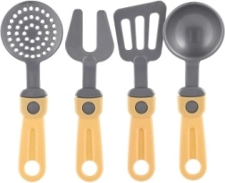 Sættet indeholder tre gryder med låg og fire forskellige køkkenværktøjer, ideel til forskellige fantasifulde madlavningsaktiviteter.