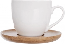 Blankt hvidt porcelæn er holdbart og let at rengøre, mens bambusunderkopperne tilfører en varm, naturlig accent og stabilitet ved servering.