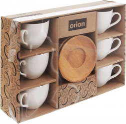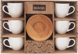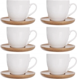 Seks hvide porcelænskopper med træunderkopper udgør en harmonisk helhed og pynter på ethvert bord. Ideelt til hjemmebaristaer og som gave.