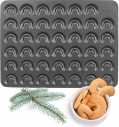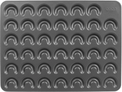 Denne kvalitetsform i metal gør det hurtigt og effektivt at bage små horn med perfekt ensartet form. Nonstick-laget minimerer brugen af fedt, forhindrer fastbrænding og gør det nemt at vende bagværket ud uden at beskadige den sarte dej. Med målene 42 × 32 × 0,7 cm og 41 fordybninger sparer du både tid og energi.