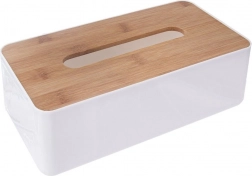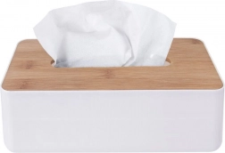Designboks til servietter af kvalitets hvid plast med låg af naturligt bambustræ sikrer et rent, moderne look og bekvem dosering af servietter. Med målene 26 × 13 × 8,5 cm rummer den store pakker og holder servietterne altid inden for rækkevidde.