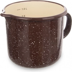 Stilfuldt brunt emaljeret krus med beige stænk i retrodesign gør daglig madlavning og bagning lettere. Takket være den praktiske hældetud er det nemt at hælde, og den indvendige måleskala muliggør præcis afmåling af væsker og tørre ingredienser uden ekstra redskaber. Det solide håndtag sikrer sikker og behagelig håndtering.