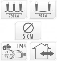 Installationen er hurtig og bekvem – hver fatning er udstyret med en praktisk krog til ophængning. Lyskæden har IP44, så den er beskyttet mod vandsprøjt og velegnet til udendørs brug. Takket være energibesparende LED kan du nyde smukt lys med lavt energiforbrug.